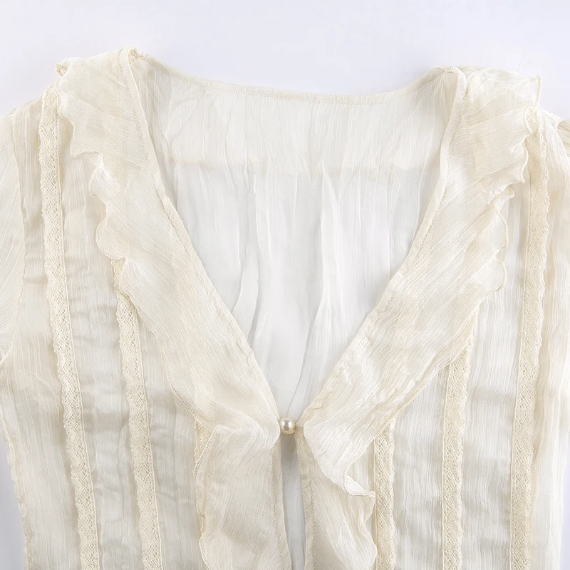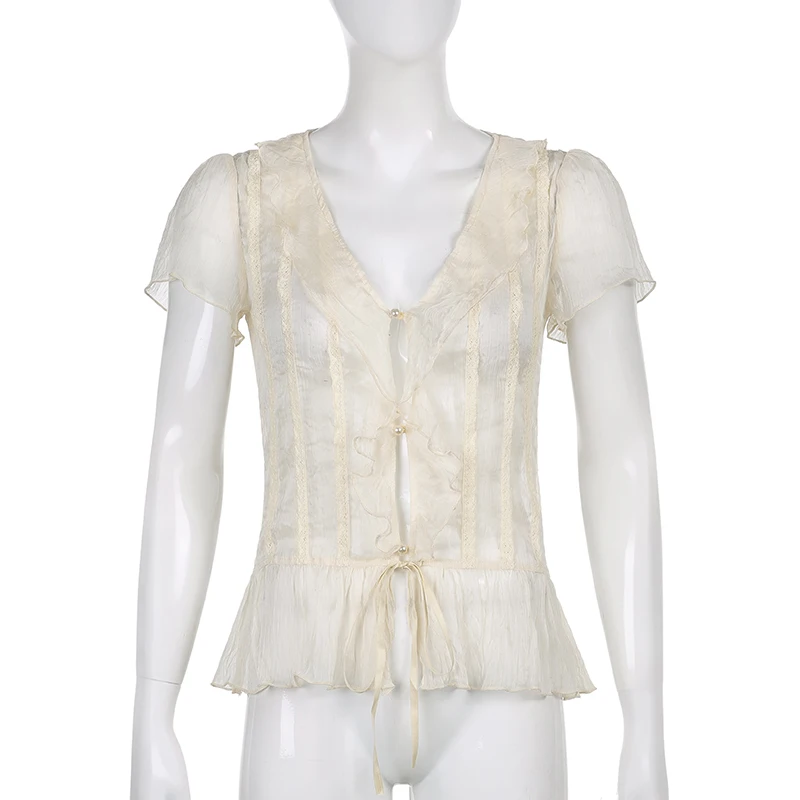 Сетчатая Прозрачная Футболка HEYounGIRL с коротким рукавом, женская летняя Просвечивающая футболка с V-образным вырезом и оборками, женская футболка с Кулиской
