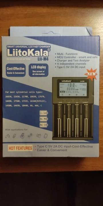 Бренд: LiitoKalaМодель: Lii-M4Входное напряжение: 5 В/2 а постоянного токаВыход напряжение: DC 4,2 V / DC 1,48 V/3,65 V DC/DC 4,35 V / 5VВыходной токТок зарядки литиевой батареи:500мА * 4/1000мА * 2NiMH ток зарядки аккумулятора: 500 мА * 4Выходной ток USB 5 В: 1000 мАХарактеристики аккумуляторной батареи: 26650,21700,18650,18350, 20650,14500, AA, AAA, C,SC и т. д.Метод прерывания: Интеллектуальный контроль напряженияРазмеры: 146 мм (длина) * 100 мм (ширина) * 33 мм (высота).