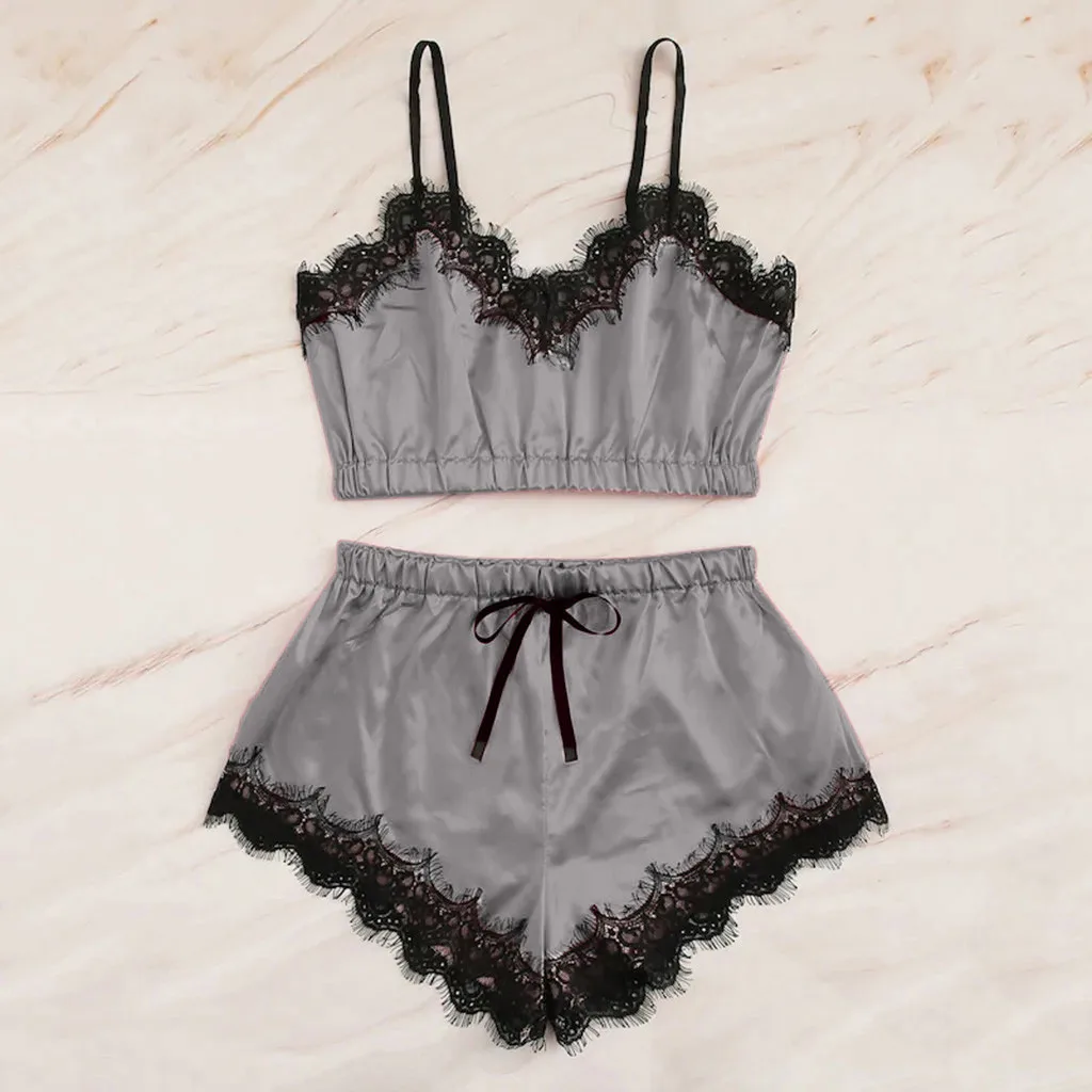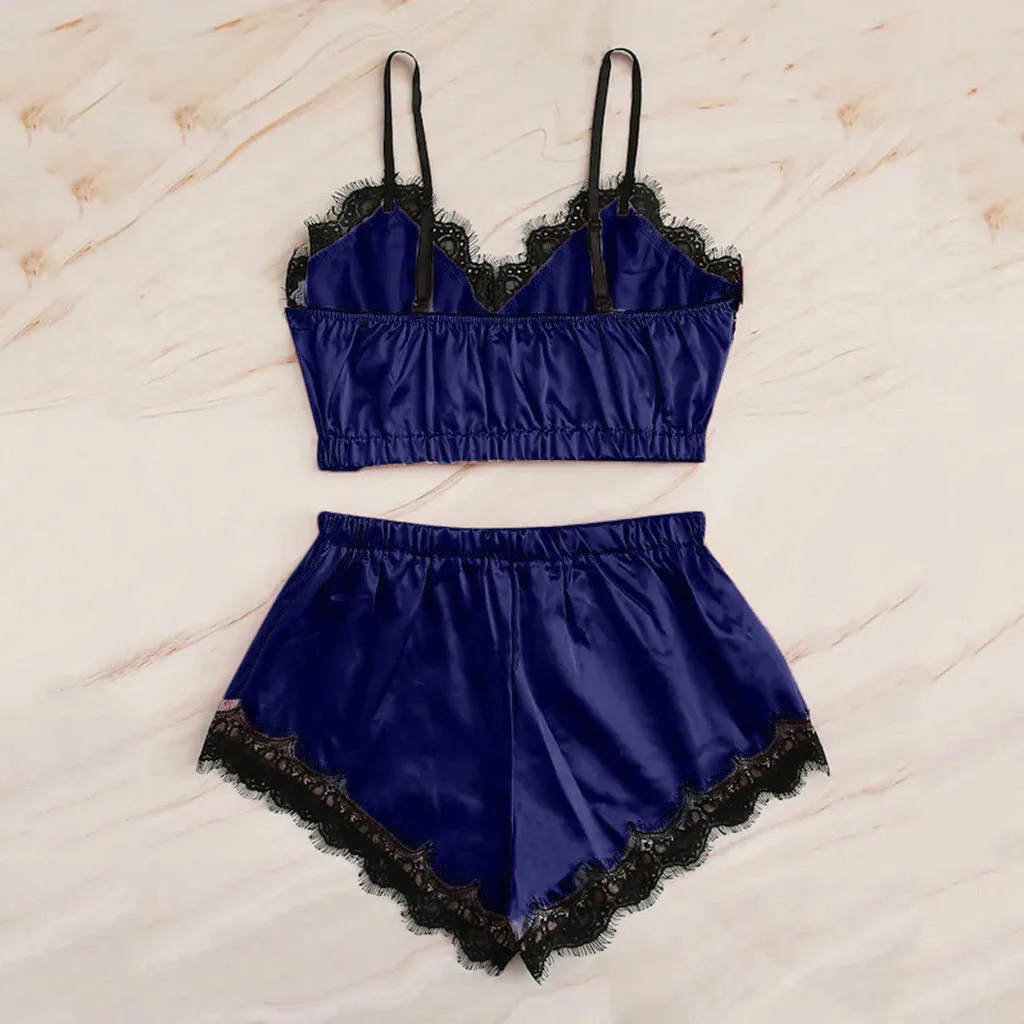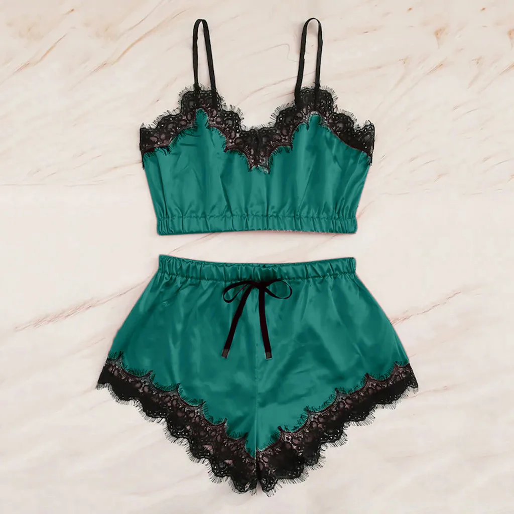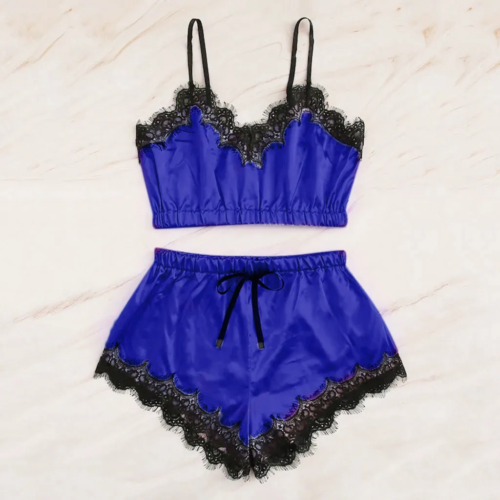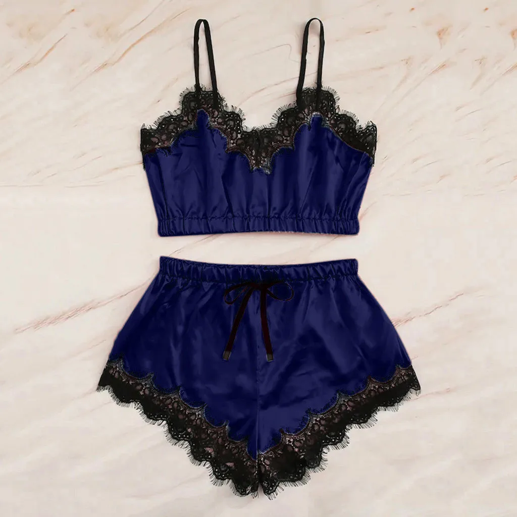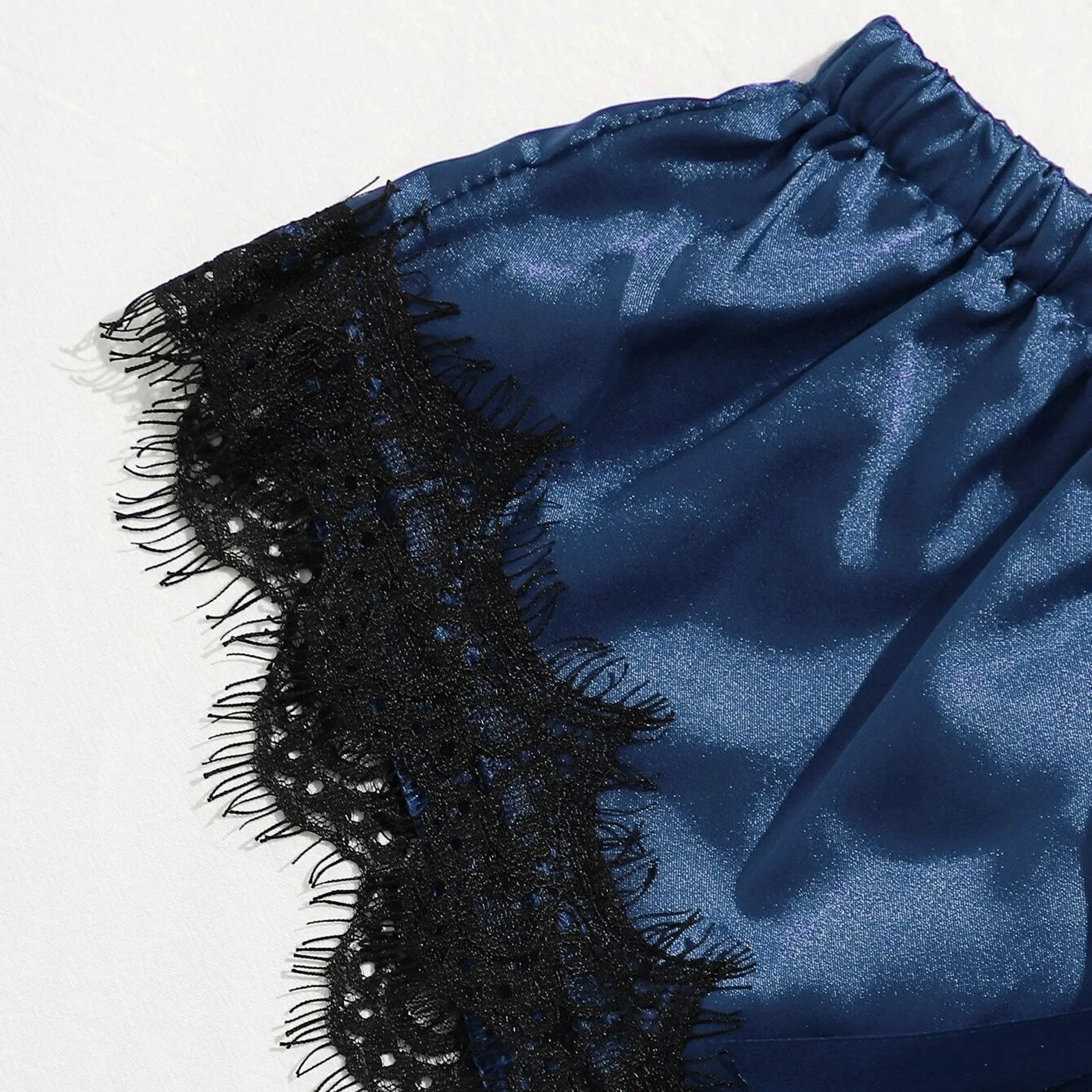 Пижама женская кружевная однотонная с V-образным вырезом и шортами