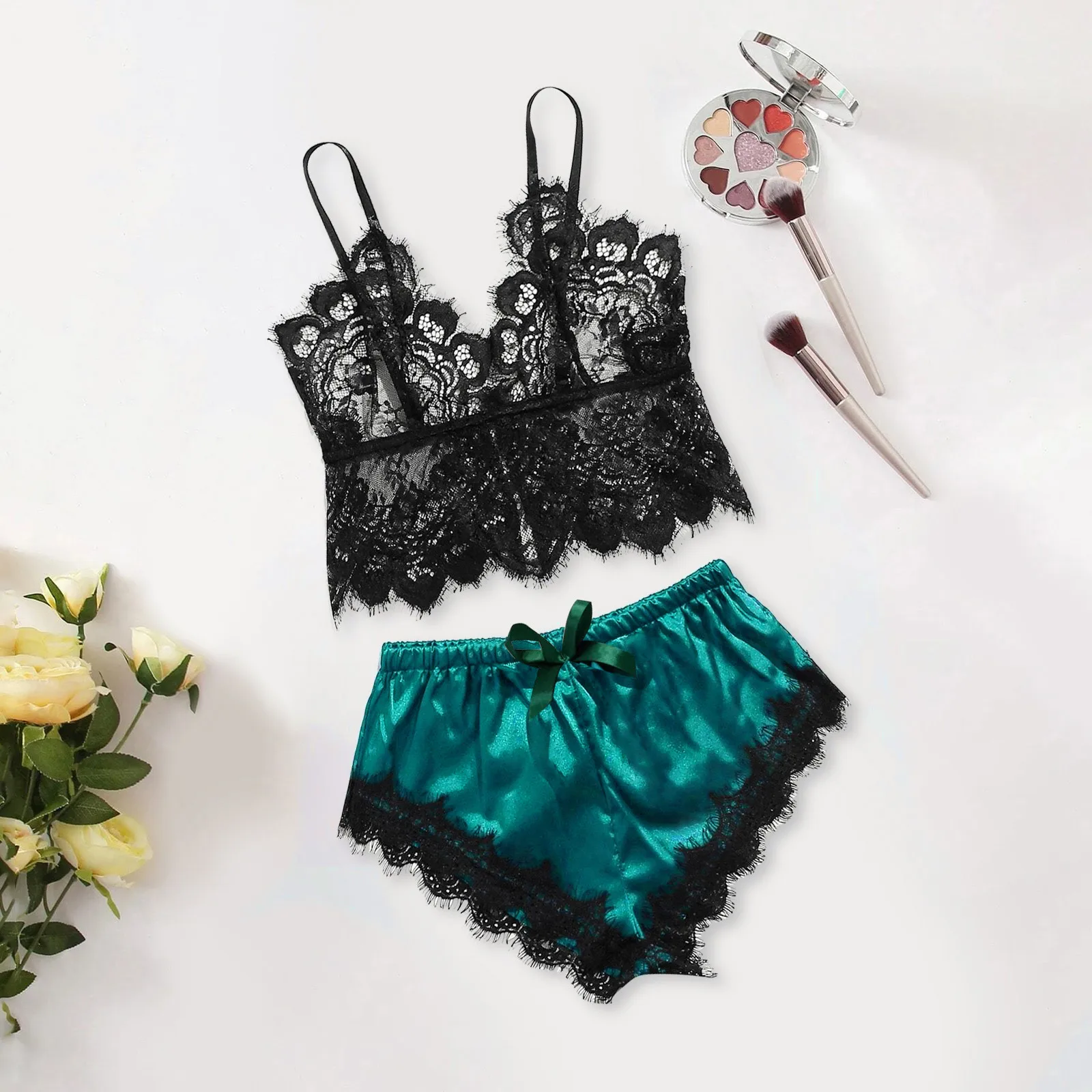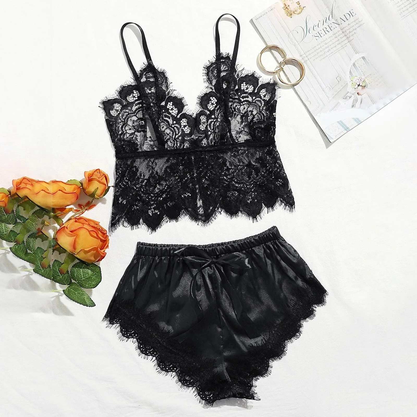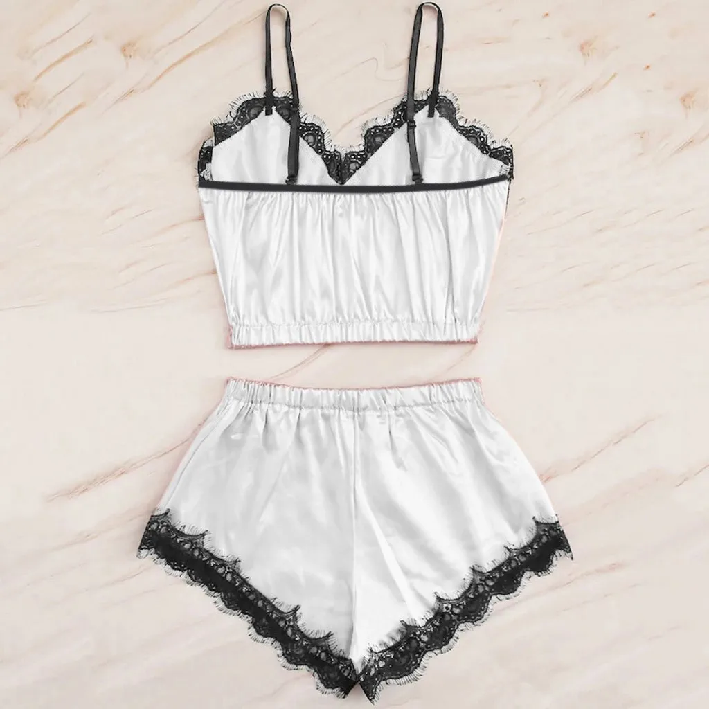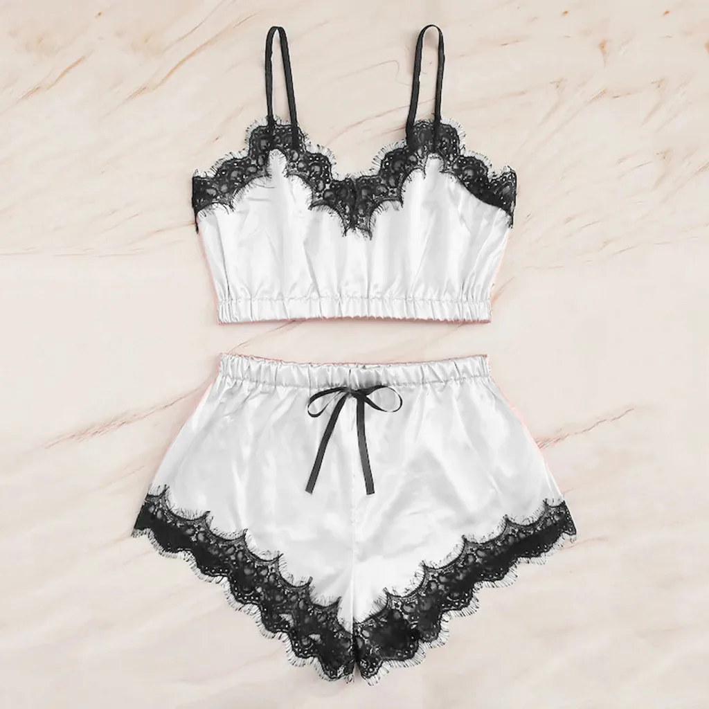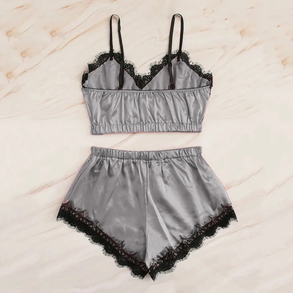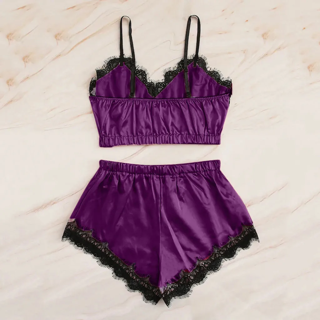 Пижама женская кружевная однотонная с V-образным вырезом и шортами