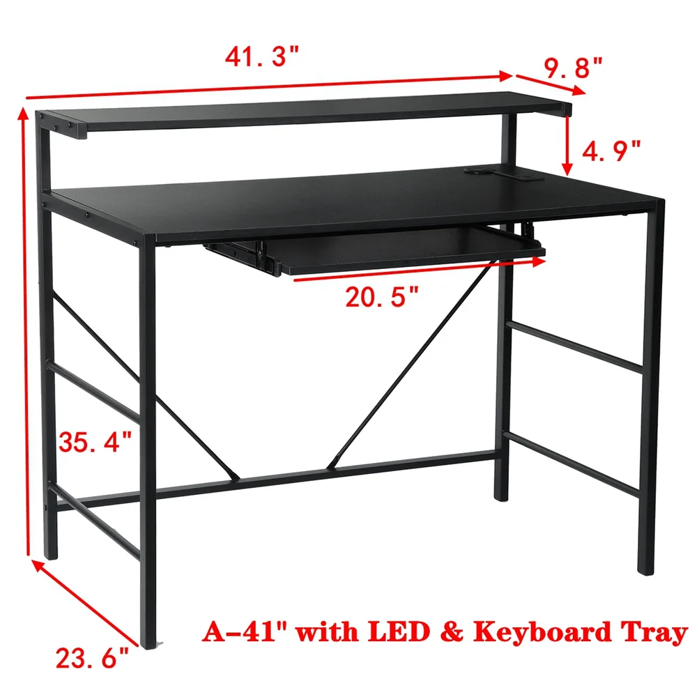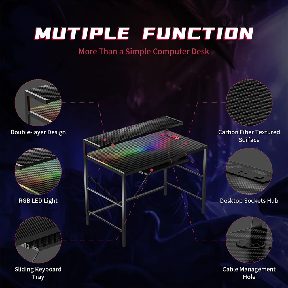 Особенности:-Превосходный игровой опыт: наш игровой стол разработан специально для любителей электронного спорта. Весь Рабочий стол покрыт текстурой из углеродного волокна, что очень круто и приятно на ощупь.-Прочный и долговечный: Изготовлен из железной рамы и МДФ класса P2, отличается высокой прочностью и хорошей стабильностью. А поверхность рабочего стола из углеродного волокна эффективно защищает от царапин и повреждений водой.-Двухслойный дизайн: Этот Двухслойный дизайн поможет вам лучше организовать предметы на компьютерном столе. Вы можете разместить на нем все, что захотите, например, принтеры, настольные лампы, Комнатные растения или другие офисные принадлежности.-Светильник: многофункциональсветильник светодиодный фонарь цветной Регулируемый СВЕТОДИОД позволяет избавиться от скоб, погрузиться в игру, получить от него чистую радость.-Многофункциональность: поставляется с отверстиями для кабеля и держателем для розетки, что позволяет аккуратно организовать все кабели. Вам не нужно потрудиться подключить другую розетку к профессиональному настольному компьютеру. И мы прячем провода за компьютерным столом, что значительно гарантирует красоту компьютерного стола.-Простота сборки: требуется минимальное усилие по сборке. С пошаговой инструкцией и входящими в комплект инструментами для сборки вы получите удовольствие от этого современного простого домашнего офисного стола, когда закончите его.
