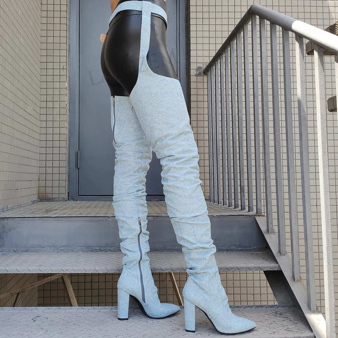 BERZIMER/женские ботинки из джинсовой ткани, с боковой молнией, с острым носком, на не сужающемся книзу массивном каблуке; Сапоги выше колена; Обувь с поясом; Женская обувь; Большие размеры 38, 41, 45, 47