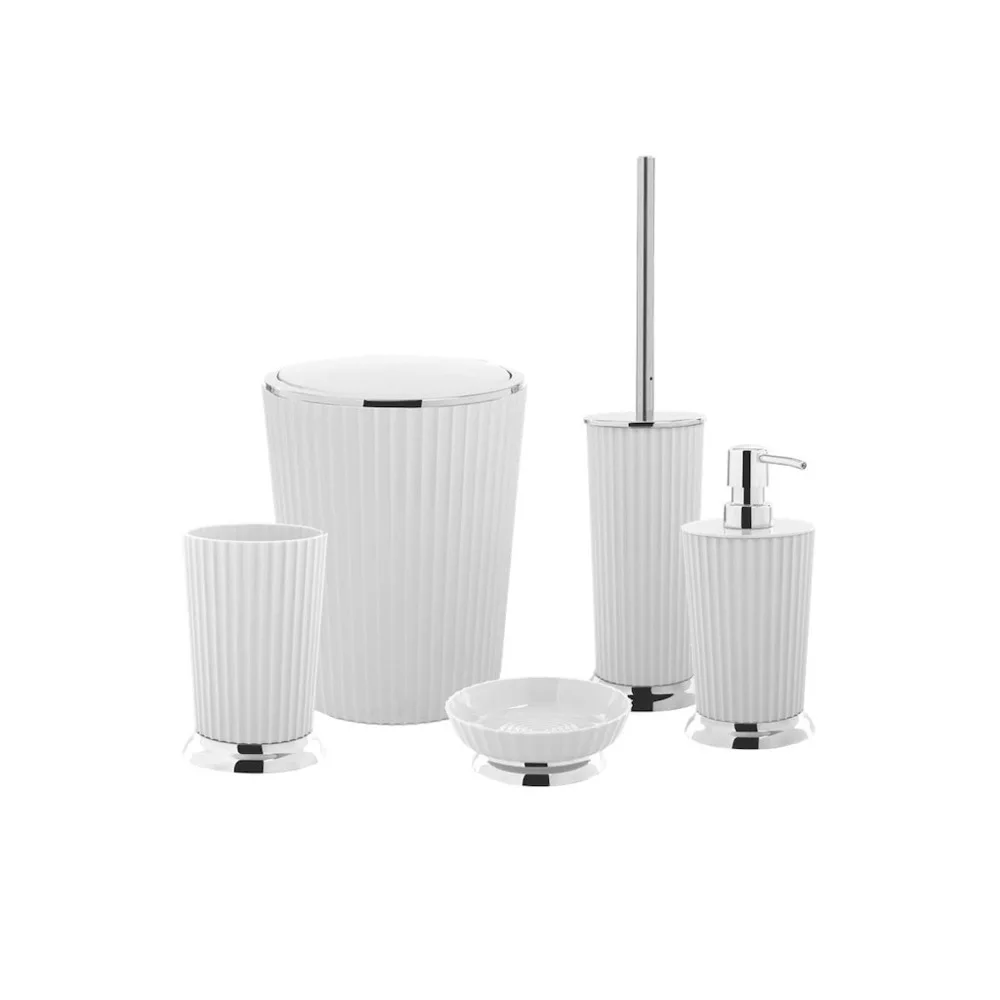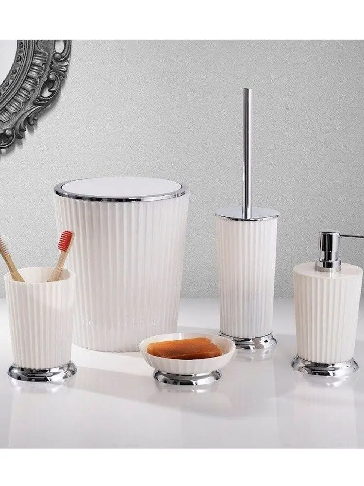 Набор для ванной комнаты из 5 предметов, белый цвет, набор для ванной комнаты, мусорное ведро для ванной комнаты, держатель для мыла, аксессуары для ванной комнатыНабор из 5Набор для ванной комнаты Primanova Nely White Chrome состоит из 5 предметов.• Дозатор жидкого мыла Ø9 20 см,• Дозатор мыла Ø12 4 см,• Держатель зубной щетки Ø9 14 см,• Ведро с крышкой Ø18 24 см,• Доступна туалетная щетка Ø9 34 см.• Изделия изготовлены из пластика.