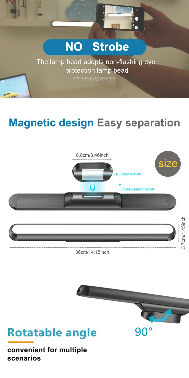 Яркость с регулируемой яркостью-есть 2 способа управления, один-сенсорное управление, другой-дистанционное управление (стиль дистанционного управления). Короткое касание для включения/выключения, длительное касание для более яркого и диммера, плавно регулируемое. И он запоминает Вашу последнюю настройку яркости, не нужно каждый раз регулировать, безопасно для детей.Регулируемый угол -- светильник шкафа может регулироваться на держателе с 45, 90 и 135 градусами, чтобы удовлетворить светильник под разными углами.Удобный Установка и Портативный -- приложенный Экстра никелированный ферромагнитного, для неметаллических поверхностей, клейкую ленту 3м-это усовершенствованная модель. Беспроводной портативный для любого места, для шкафа, под шкафом, прихожей, лестниц, ванной комнаты, спальни, кухни, детской комнаты, багажника автомобиля, туалетного зеркала.5 в USB Перезаряжаемый-Встроенный аккумулятор емкостью 2000 мАч, не нужно покупать дополнительные батареи, экологически чистые и экономят деньги.Бесплатные замены-мы предоставляем 12 месяцев гарантии, просто свяжитесь с нами, если есть какие-либо проблемы. Примечание. Пожалуйста, зарядите его перед первым использованием.Легко устанавливается и снимается везде, идеально подходит для крепления в спальне для чтения книги на ночь, в общежитии для учебы, в гардеробе для выбора ткани, в кухонном шкафу для освещения и многого другого.Не нужно никаких инструментов, просто используйте сильную никелированную ферромагнитную пасту там, где вы хотите установить его!Прилагается дополнительный магнит, больше выбора, удобно для вашего изменения положения.