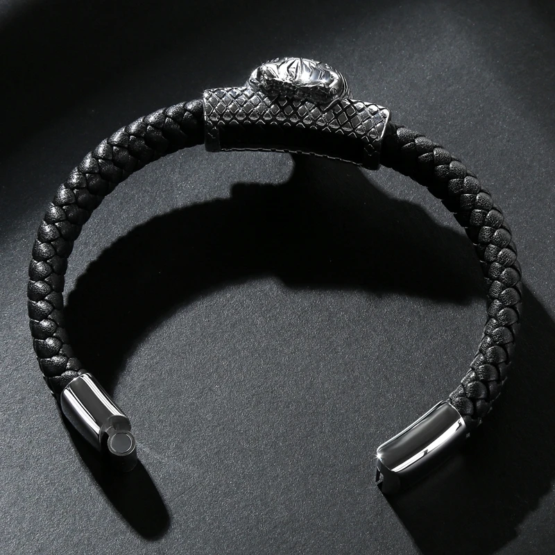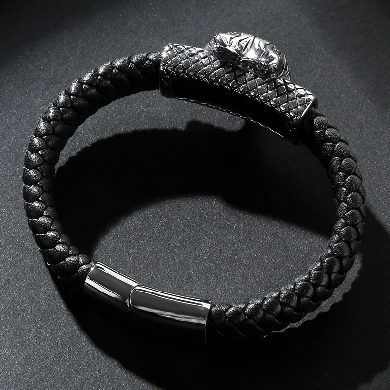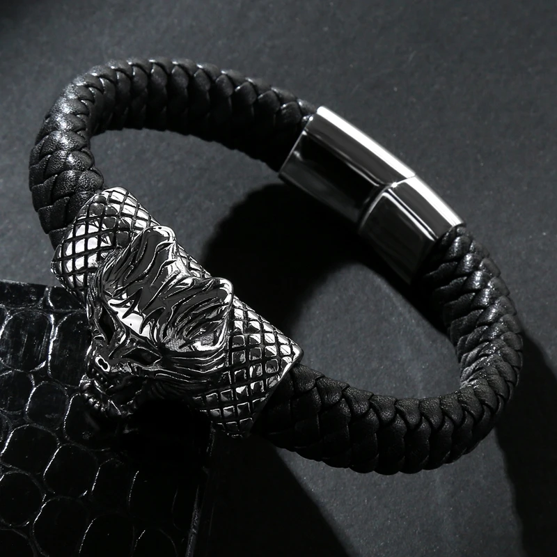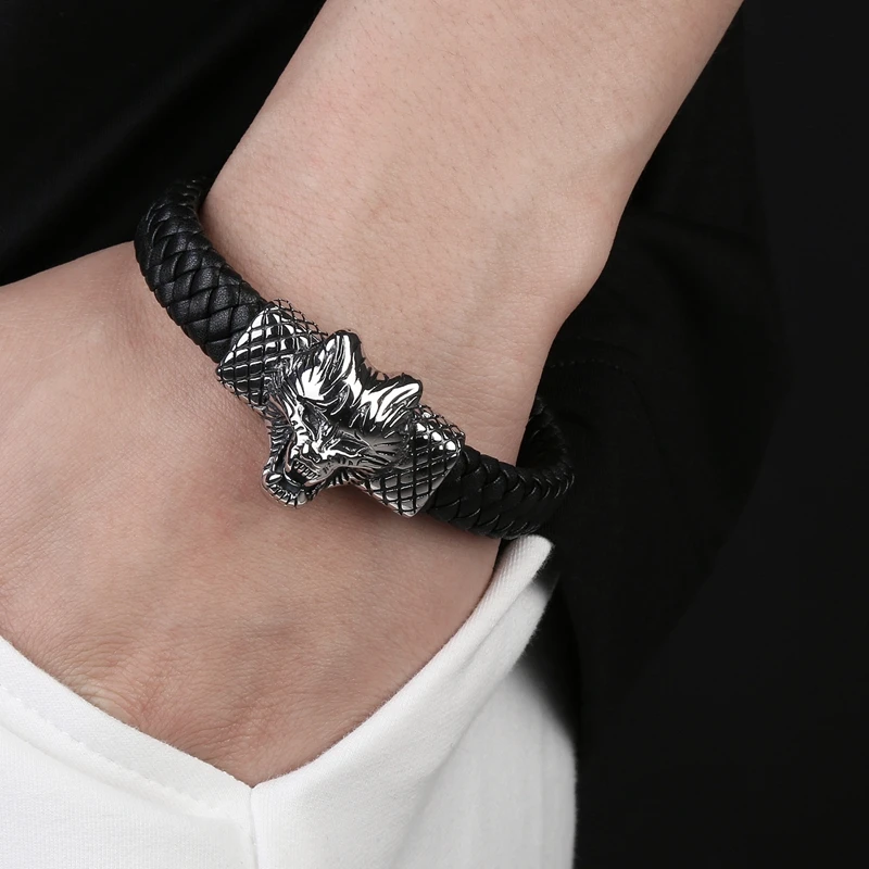 Модный плетёный шнур браслет мужской Панк ювелирные изделия голова Волка кожаный браслет из нержавеющей стали лучший подарок для парня P146
