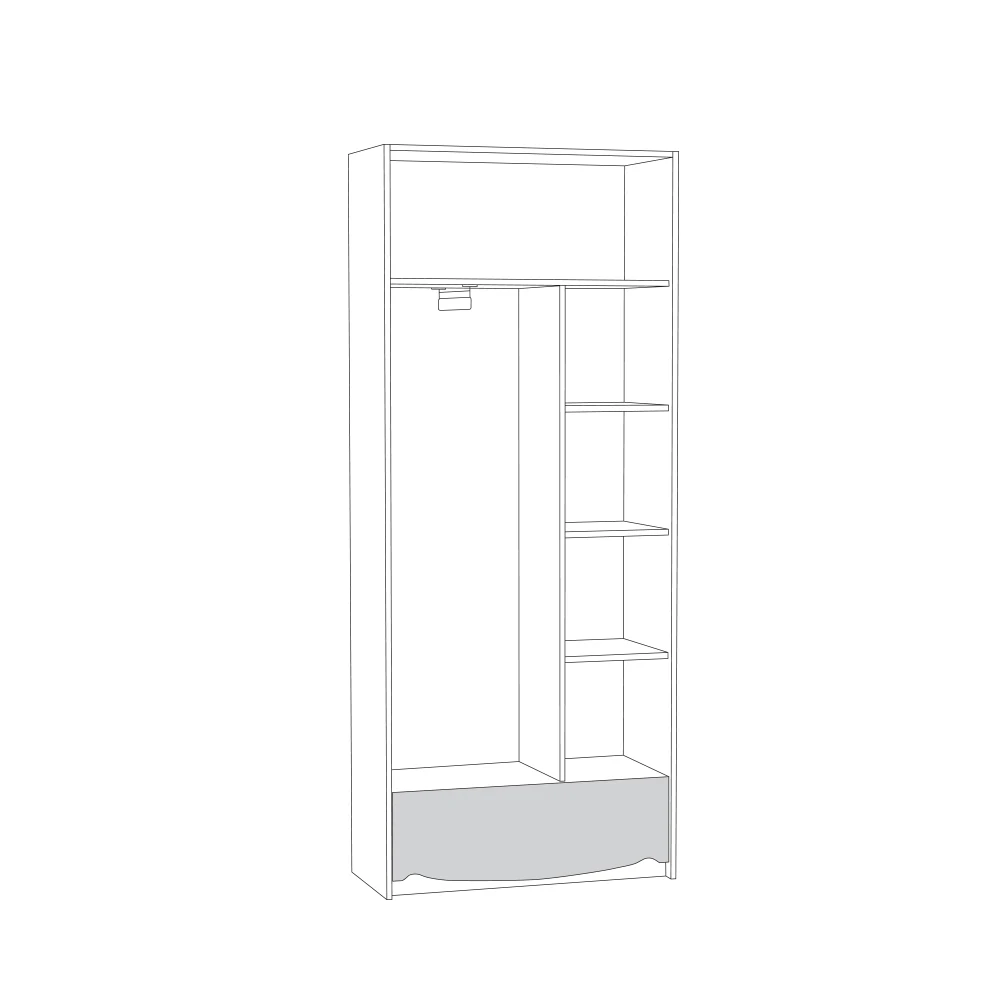 Классический гардероб с выдвижной штангой для вешалок и четырьмя полками практично дополнен вместительным ящиком для белья.