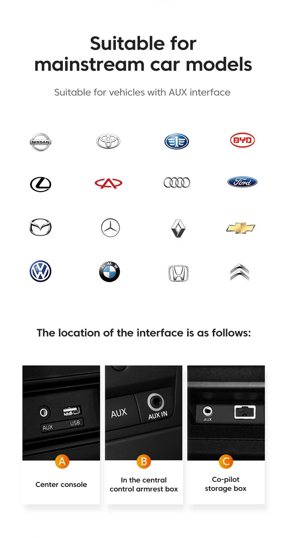 Подходит для основных моделей автомобилейПодходит для транспортных средств с интерфейсом AUXРасположение интерфейс выглядит следующим образом:A: центральная консольB: в подлокотнике Центрального управленияC: ящик для хранения со-пилотом