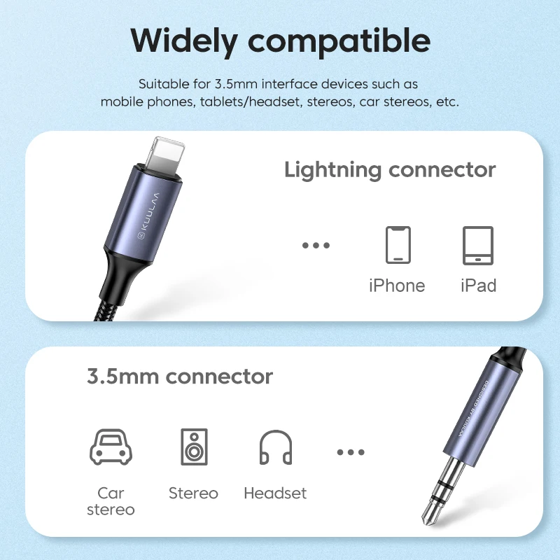 Широко совместимыйПодходит для 3,5 мм Интерфейс устройств, таких как мобильные телефоны, планшеты/гарнитура, стерео-и акустическими системами автомобильными стерео-и акустическими системами и т. д.Разъем Lightning: iPhone /iPad3,5 мм разъем: стерео/стерео гарнитура