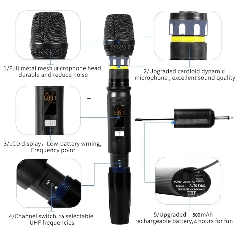 Беспроводная портативная микрофонная система для караоке, вечерние, DJ, деловые встречи, выступления или другие мероприятия на открытом воздухе и в помещении.Принимает частотный диапазон UHF 676 МГц до 697 МГц (канал A: 677 МГц-686 МГц; Канал B: 687 МГц-696 МГц), сильный анти-помех.A/D и D/A используются для высокопроизводительного аудио 24 бит/48 кГц; С помощью ID кода + частоты для шифрования данных на частоту, что повышает стабильность соединения.С автоматической схемой отключения звука и устранения ударов, чтобы избежать воздействия и шума переключения; Чрезвычайно высокая чувствительность и отличное качество тона делают вашу речь или пение более четким.Расстояние беспроводной передачи составляет от 30 до 50 метров; Несколько устройств (макс.. 16 комплектов) может использоваться одновременно без помех или частоты.Стиль: ручной микрофонПолярные узоры: всенаправленныеСвязь: БеспроводнаяПреобразователь: конденсаторный микрофонТип набора: Один микрофонИспользование: сценический беспроводной микрофонСистемыЧастотная характеристика: 676-697 МГцНомер канала: 10 (консервативные значения) каждый раз, идентификационный код случайного изменения, в диапазоне частот, установленных производителемОсциллятор: чип DSP Блокировка частотыСтабильность частоты: +/-10ppmИскажение: менее 0.5%ПриемникЧувствительность: от-95 до 71dBmЧастота звука: 40 - 18000 ГцSNR: больше или равен 90 дБАудиовыход: 1/4 дюйма несимметричный выход 300 мВИсточник питания: Встроенный аккумулятор 1000 мАВес приемника: 49g/1,7 ozПередатчикМощность RF: 10 дБмЧастота звука: 40 - 18000 ГцИсточник питания: 2 * батарейки типа АА (не входят в комплект)Вес передатчика: 203g/7,2 oz (без батарей)Цвет: черныйМатериал: металл + пластикРазмеры: передатчик Размеры: 23*4 см/9,1 * 1.6inРазмер приемника: 12,5*3,5*2 см/4,9*1,4 * 0.8inПосылка:1 * приемник1 * микрофон1 * антенна1 * USB линияКонвертер 1*3,5 мм1 * Руководство пользователяТолько вышеуказанная посылка, другие товары не включены.Примечание: светильник и различные дисплеи могут привести к тому, что цвет товара на картинке немного отличается от реального. Допускается погрешность в измерениях +/- 1-3 см.