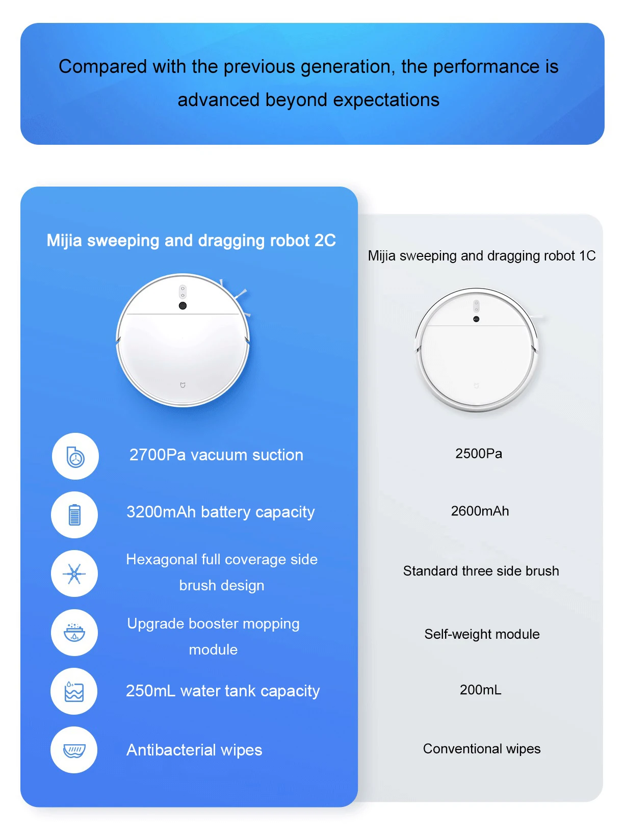 По сравнению с предыдущим поколением, производительность превзошла ожиданияMijia робот для уборки и уборки 2C2700 ПА вакуумное всасываниеЕмкость аккумулятора 3200 мАч* Шестигранная боковая щетка с полным покрытиемОбновленный модуль бустерной уборкиАнтибактериальные салфеткиMijia робот для уборки и уборки 1С2500 Па2600 мАчСтандартная трехсторонняя щеткаСобственный вес modulОбычные салфетки