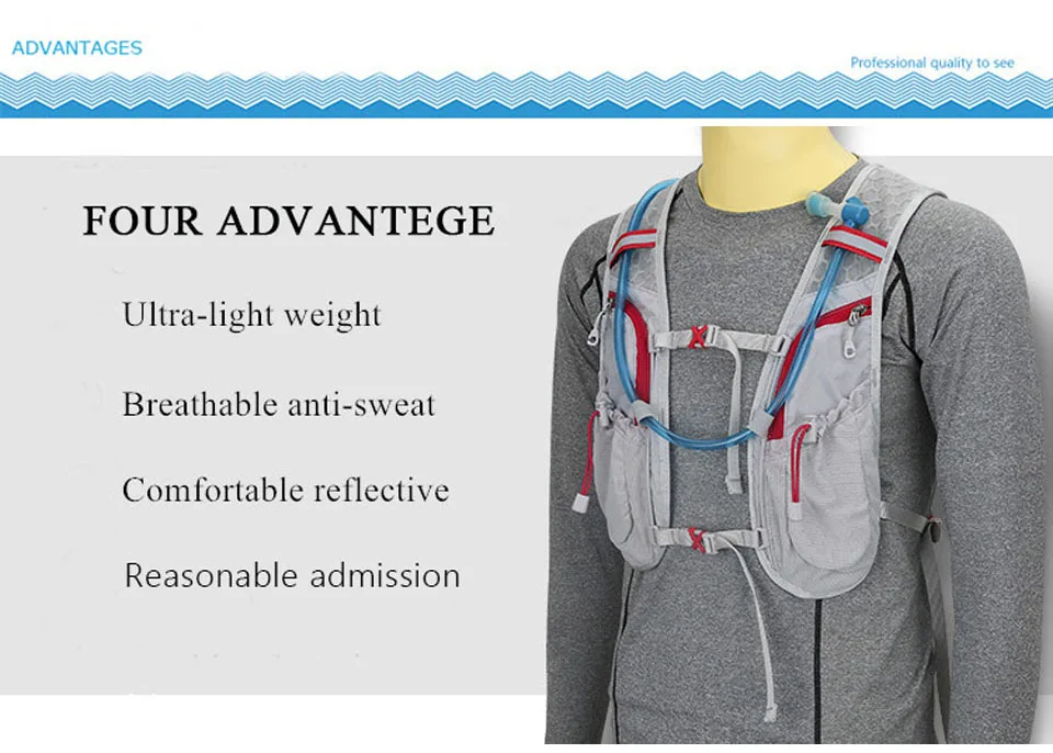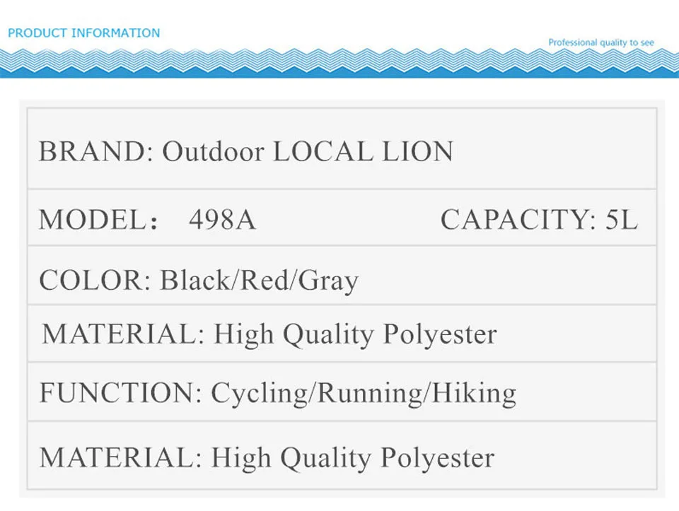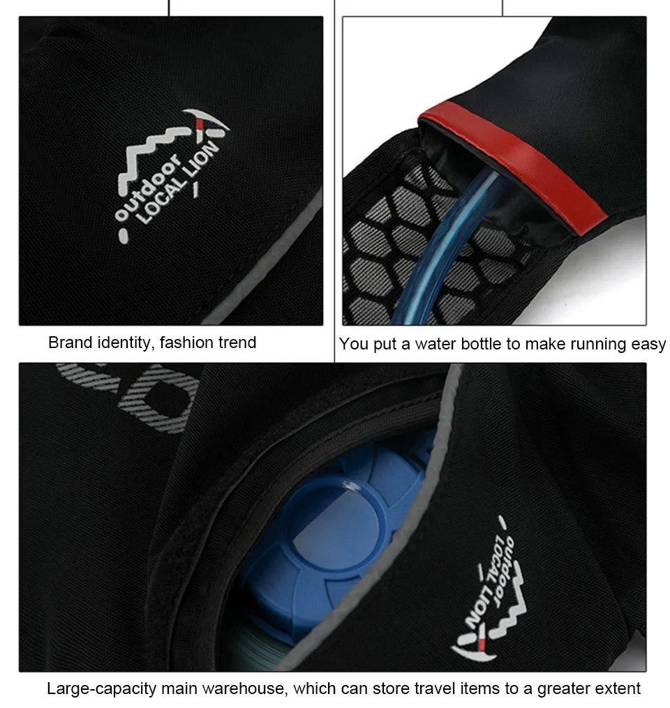 Особенности:Водоотталкивающая и разрывная нейлоновая ткань.Высококачественные молнии, легко застегиваются и снимаются.Дышащая мягкая задняя панель, регулируемый ремень грудины и плечевой ремень.Боковые и передние регулируемые ремни для подвешивания всего, что вам нужно.Поясная упаковка для сотового телефона, ключей, небольших аксессуаров.Спецификация:Материал рюкзака: нейлонЦвет: черный/красный/серыйЕмкость: 5лВес: около 250 гРазмер: 37*19*1 смСцены: Велоспорт, альпинизм, путешествия, туризм и так далееПосылка включает в себя:1 х велосипедный рюкзак