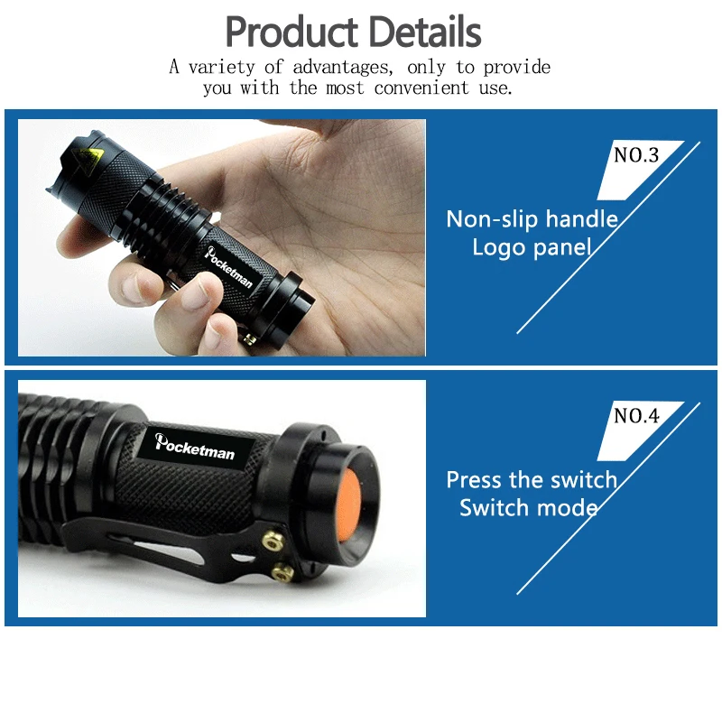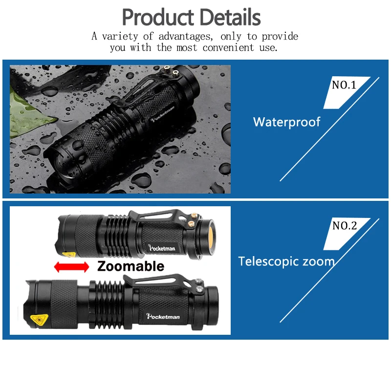 Особенности:Супер Мини размер, яркий, ослепляющий эффект.Противоскользящий дизайн и водонепроницаемый дизайн.Выходная яркость может достигать 2000 люменов (макс.).Регулируемый диапазон фокусировки для различного использования, растягивается для регулировки фокуса.Зажим для удобной переноски.Рабочее напряжение широкое и может использовать батареи в самой большой степени.Подходит для охоты, велоспорта, альпинизма, кемпинга и активного отдыха и т. д.