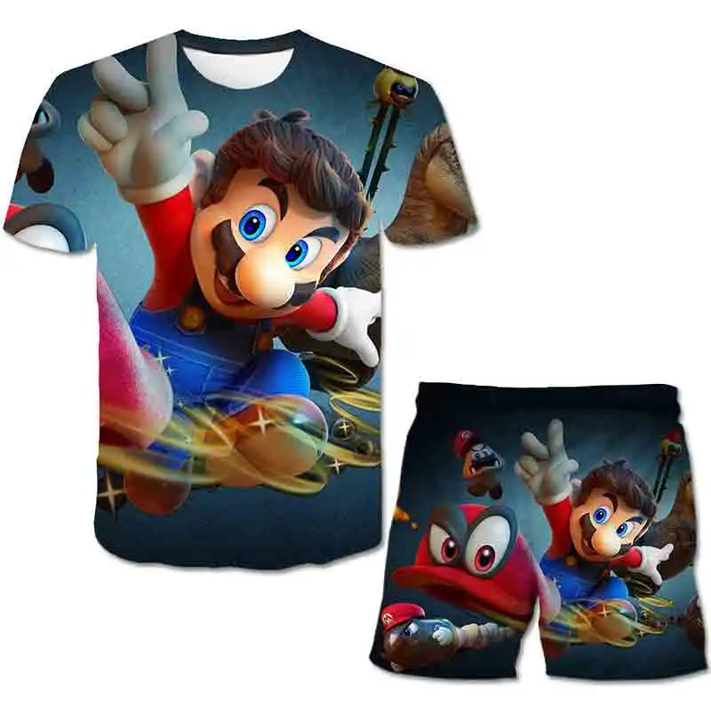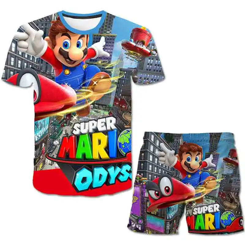 Повседневная детская одежда, комплект одежды из 2 предметов, крутая футболка для мальчиков в стиле Марио + шорты, одежда для мальчиков, мультяшный спортивный костюм, детская одежда