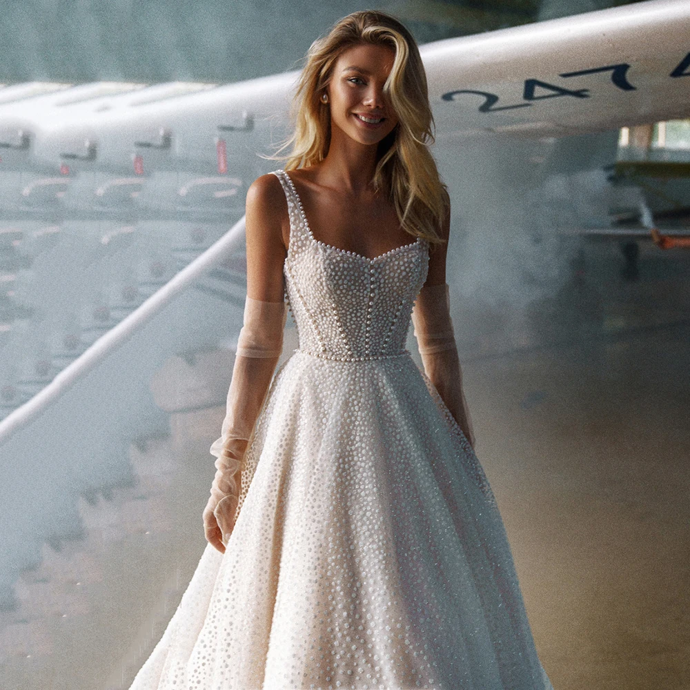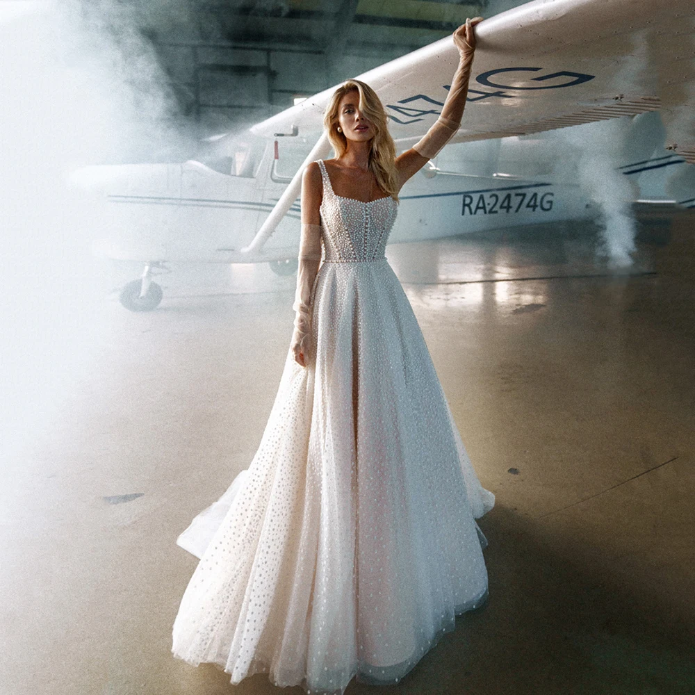 UZN цвета слоновой кости трапециевидной формы в горошек Чистая цвета слоновой кости, Свадебные платья Милая на бретелях свадебное платье с жемчугом одежда с длинным рукавом Бисер ремень свадебное платье