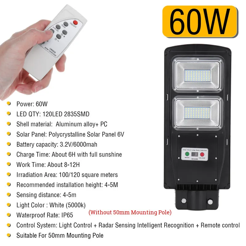 Особенности:-Светодиодный светильник высокой яркости, энергосберегающий, ровный светильник, длительный срок службы.-Солнечные панели преобразуют солнечную энергию в электричество, более экологически чистые.-Интеллектуальное управление переключателем времени. Освещение автоматически запускается в темноте, и яркость подсветки автоматически выводится во время деления.-Простая установка, без технического обслуживания надежная работа без необходимости подключения или траншеи. Прочный, водонепроницаемый алюминиевый тяжелый корпус. Включите выключатель перед установкой или зарядкой. Характеристики:Мощность: 30/60/90WСветодиодный Кол-во: 60/120/180 светодиодный 2835SMDМатериал корпуса: алюминиевый сплав + ПКПанели солнечные: поликристаллический кремний Панели солнечные 6VБатарея Емкость: 3,2 V/6000mahСистема управления: светильник + радар-датчик интеллектуального распознавания + пульт дистанционного управления(Весь светодиодный индикатор при обнаружении движения, 30%-ная мощность при отсутствии движения)Время зарядки: около 6 ч с полным солнечным светомВремя работы: около 8-12 чПлощадь облучения: 80/120 квадратных метровРекомендуемая высота установки: 3-5 мРасстояние срабатывания: 3-5 мСветильник Цвет: белый (5500k)Степень водонепроницаемости: IP65Подходит для крепежного полюса 50 см Мощность: 60 ВтСветильник источник света: 2835SMD светодиодный чип (120 шт.)Площадь облучения: 100 квадратных метровДлина монтажного полюса: 50 см Посылка включает в себя:1 Солнечный уличный светильник1x пульт дистанционного управленияНе содержит: Монтажный столб Примечание:1. Включите выключатель перед установкой и зарядкой.2. Пожалуйста, выберите позицию без какого-либо укрытия для достаточно солнечного света и полного воздействия.3. Если у вас есть какие-либо вопросы, пожалуйста, свяжитесь с нами как можно скорее, мы решим ваше удовлетворение.