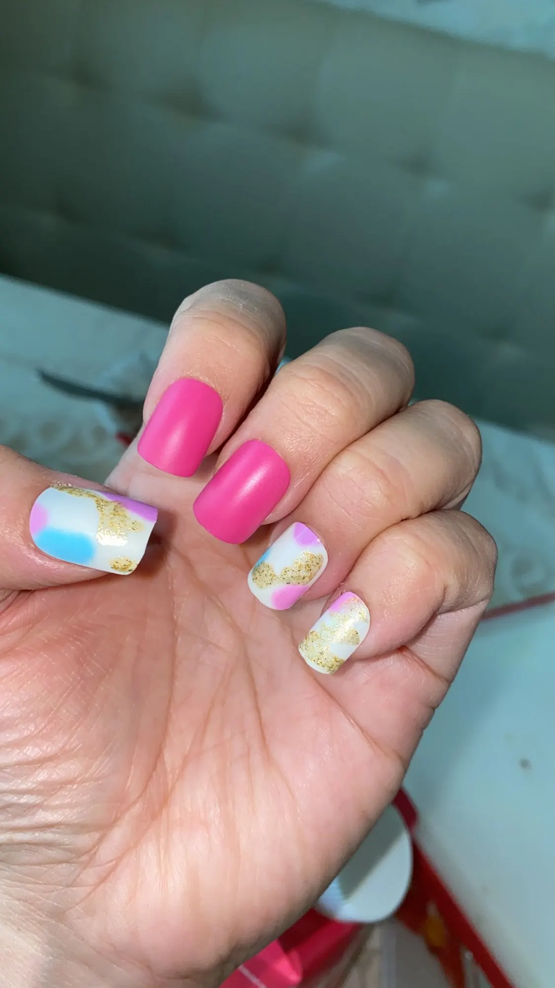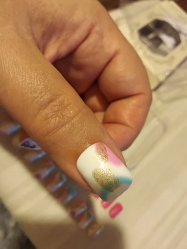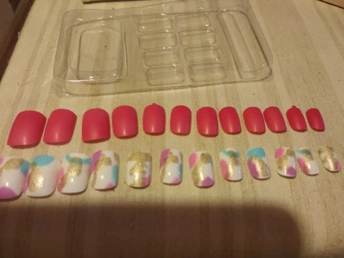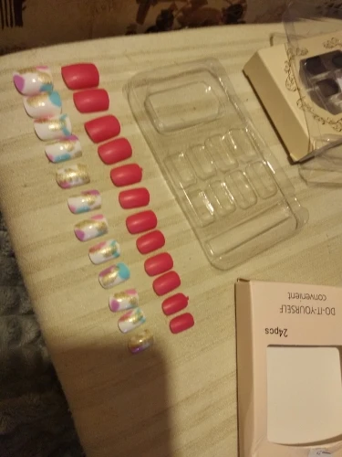 ногти пришли ровно за 7дней , на 3 недели раньше срока, была очень удивлена на Укрпочту, коробочка чуть помялась , но сами ногти в порядке, фото соответствуют, мне понравились, особенно белые с разводами, ногти плотные,не просвещаются,ещё не клеела , но приложила и сфоткала , размерчики хорошие , пришли с клейкой лентой, но мне больше нравится их клееть клеем, но это не важно, вообщем ногти отличные, очень довольна и закажу ещё их , редко когда повтатяю заказ , но эти дааа, рекомендую