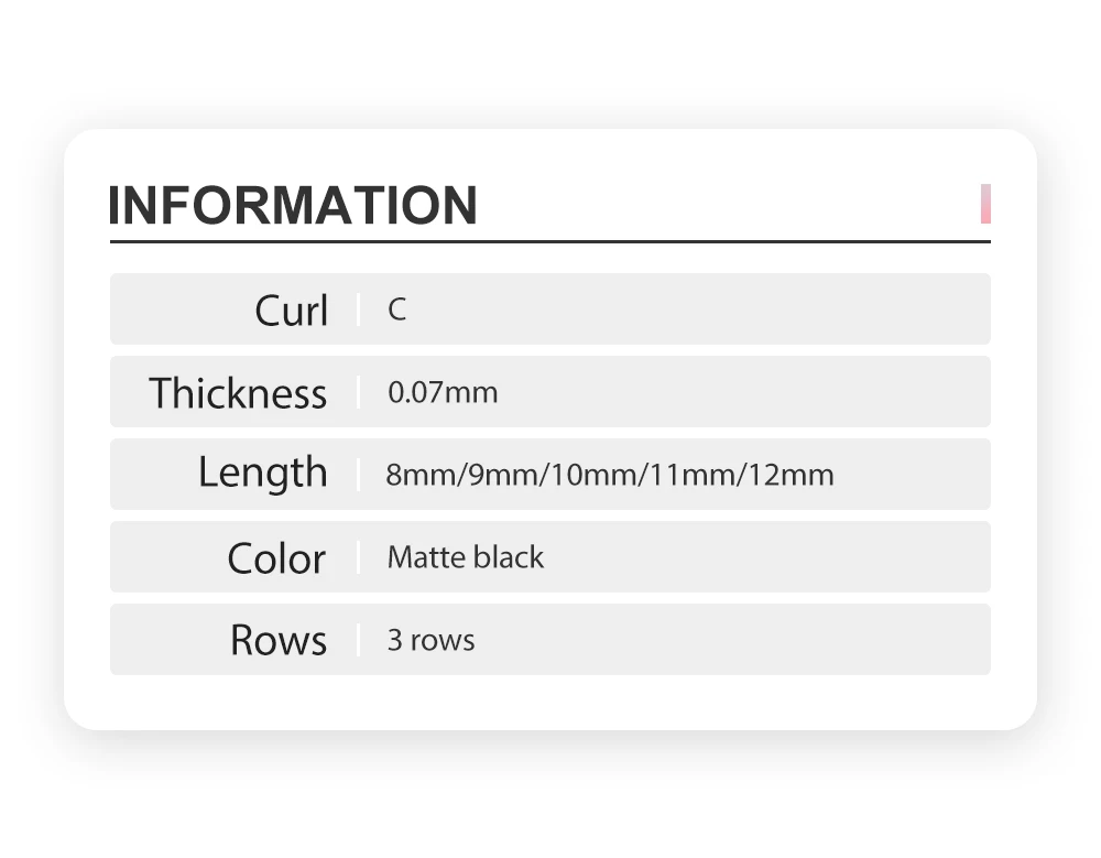 Изгиб: CДлина: 8 мм/9 мм/10 мм/11 мм/12 ммТолщина: 0,07 ммЛинии: 3 линии в одном лотке.Материал:Синтетическое волокно PTB (импортированное из Кореи).Качество сертифицировано SGS, MSDS. Мягкая и натуральная, безопасная, изгиб держится более одного года.