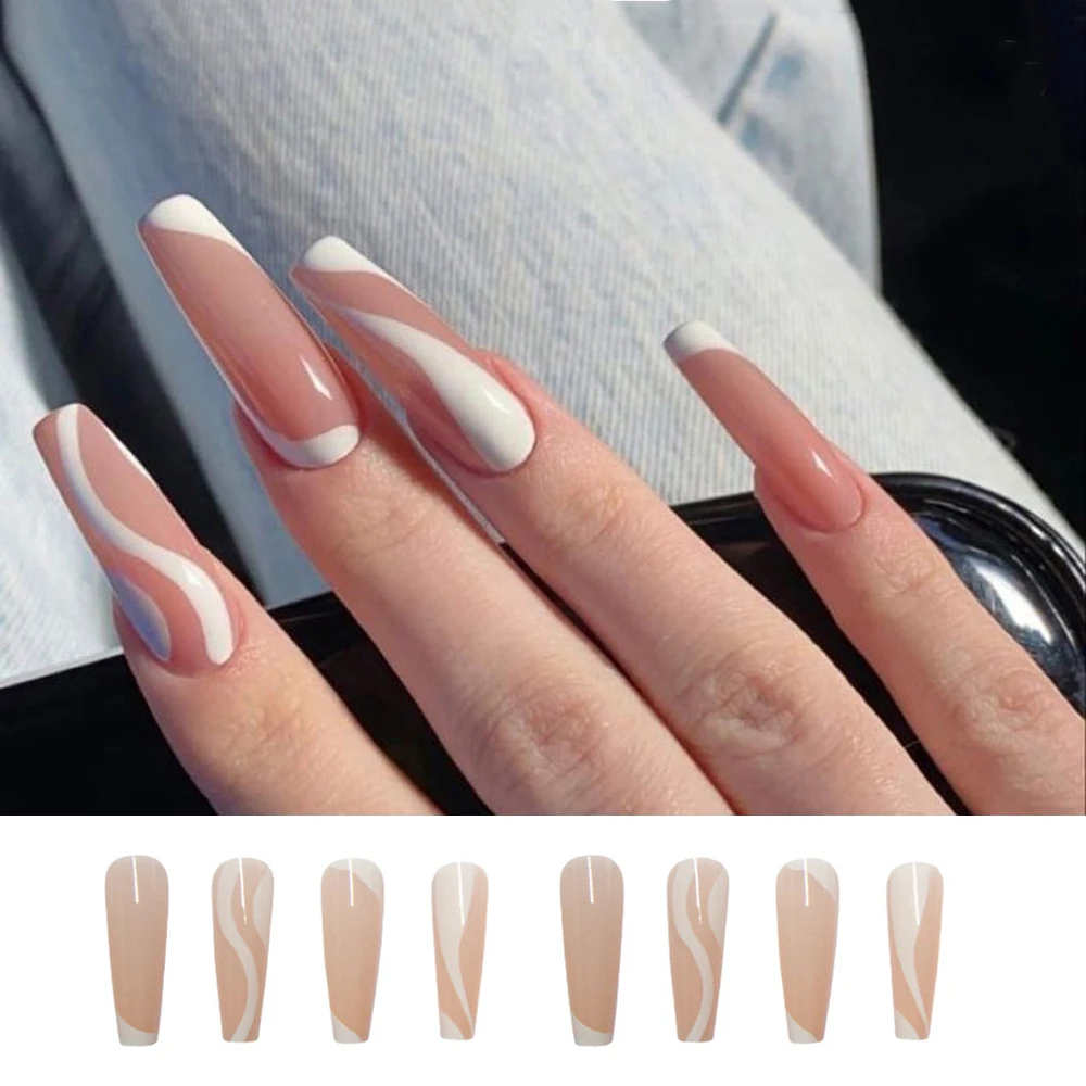 Белые волнистые телесные розовые накладные ногти с длинным нажатием...