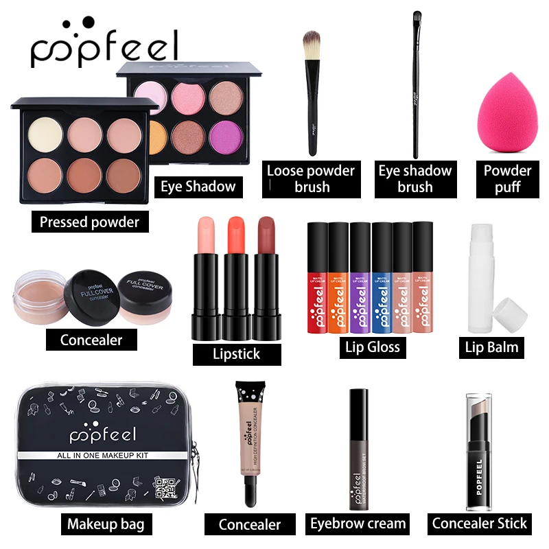 Набор для макияжа POPFEEL все в одном (тени для век, Лигатура, помада, кисти, брови, консилер), косметика для женщин, полный набор