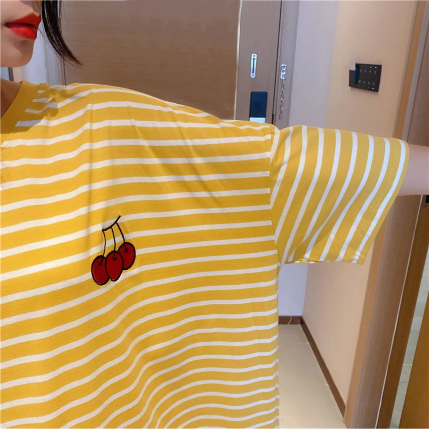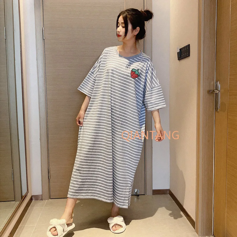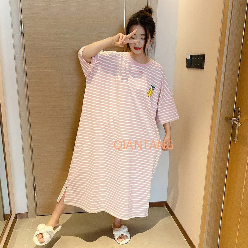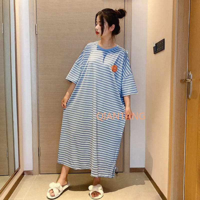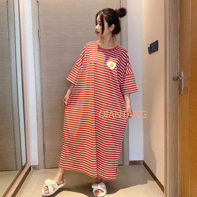 Ночная рубашка женская, из размера плюс хлопка, с коротким рукавом, домашняя пижама, 5XL, лето, полосатый Ночной костюм