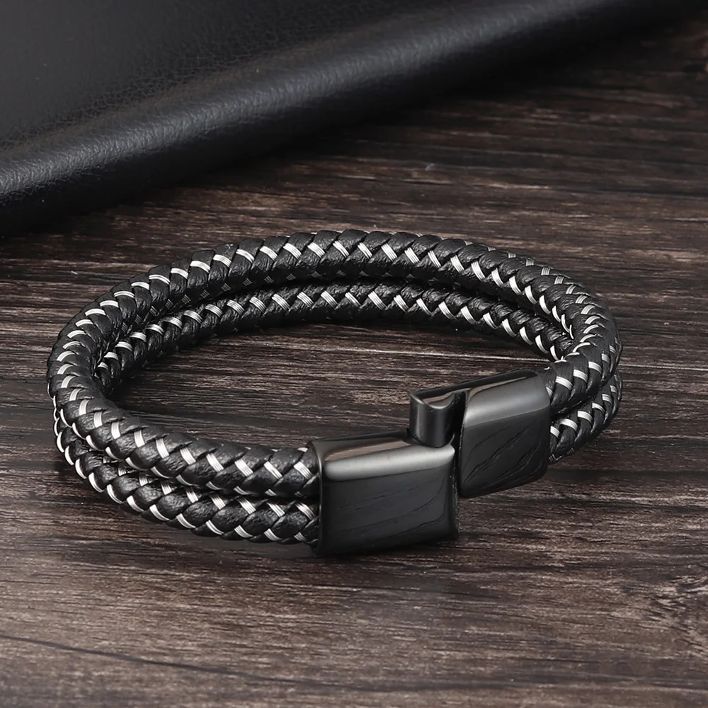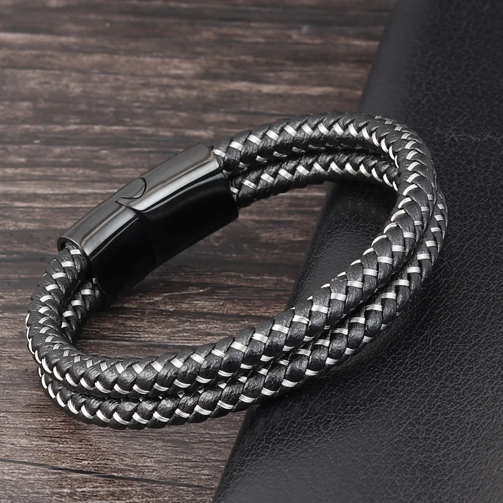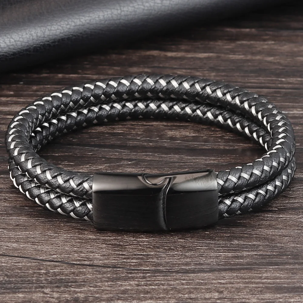 Новинка 2021, мужской браслет, Модный классический черный плетеный браслет из натуральной кожи, браслеты из проволоки из нержавеющей стали для мужчин, ювелирные изделия, подарки на день рождения