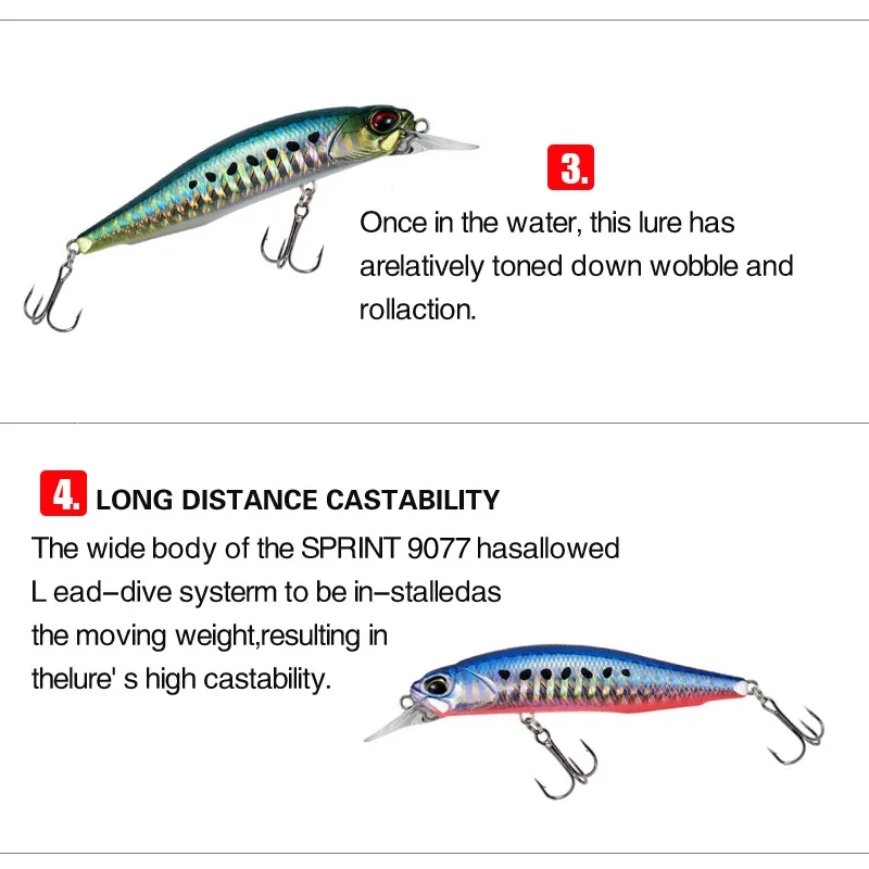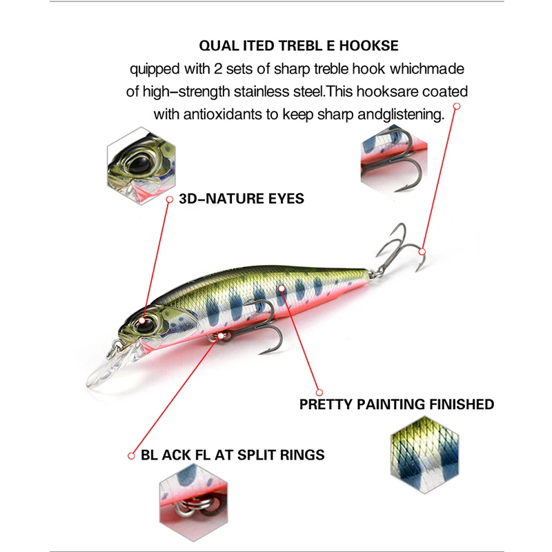 2. Приманка предназначена для обеспечения наилучшего баланса, чтобы приманка могла плавать с минимальной возможной скоростью извлечения. 3. Приманки имеют реалистичную картину и яркие 3D-глаза, приманка выглядит как настоящая рыба, плавающая в воде во время рыбалки.