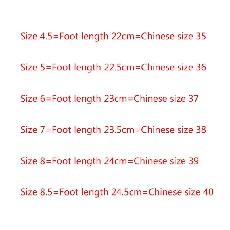 Размеры 3,5 = длина стопы 21,5 см = Китайский Размеры 34Размеры 4,5 = длина стопы 22 см = Китайский Размеры 35Размеры 5 = длина стопы 22,5 см = Китайский Размеры 36Размер 6 = длина стопы 23 см = Китайский размер 37Размеры 7 = длина стопы 23,5 см = Китайский Размеры 38Размер 8 = длина стопы 24 см = Китайский Размер 39Размеры 8,5 = длина стопы 24,5 см = Китайский размер 40