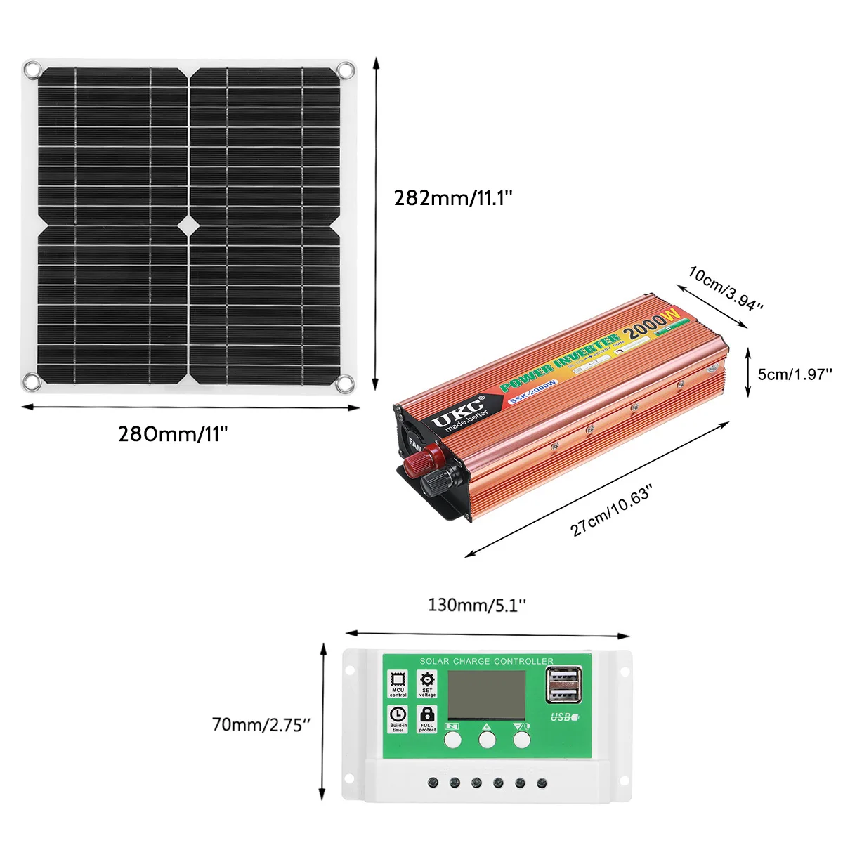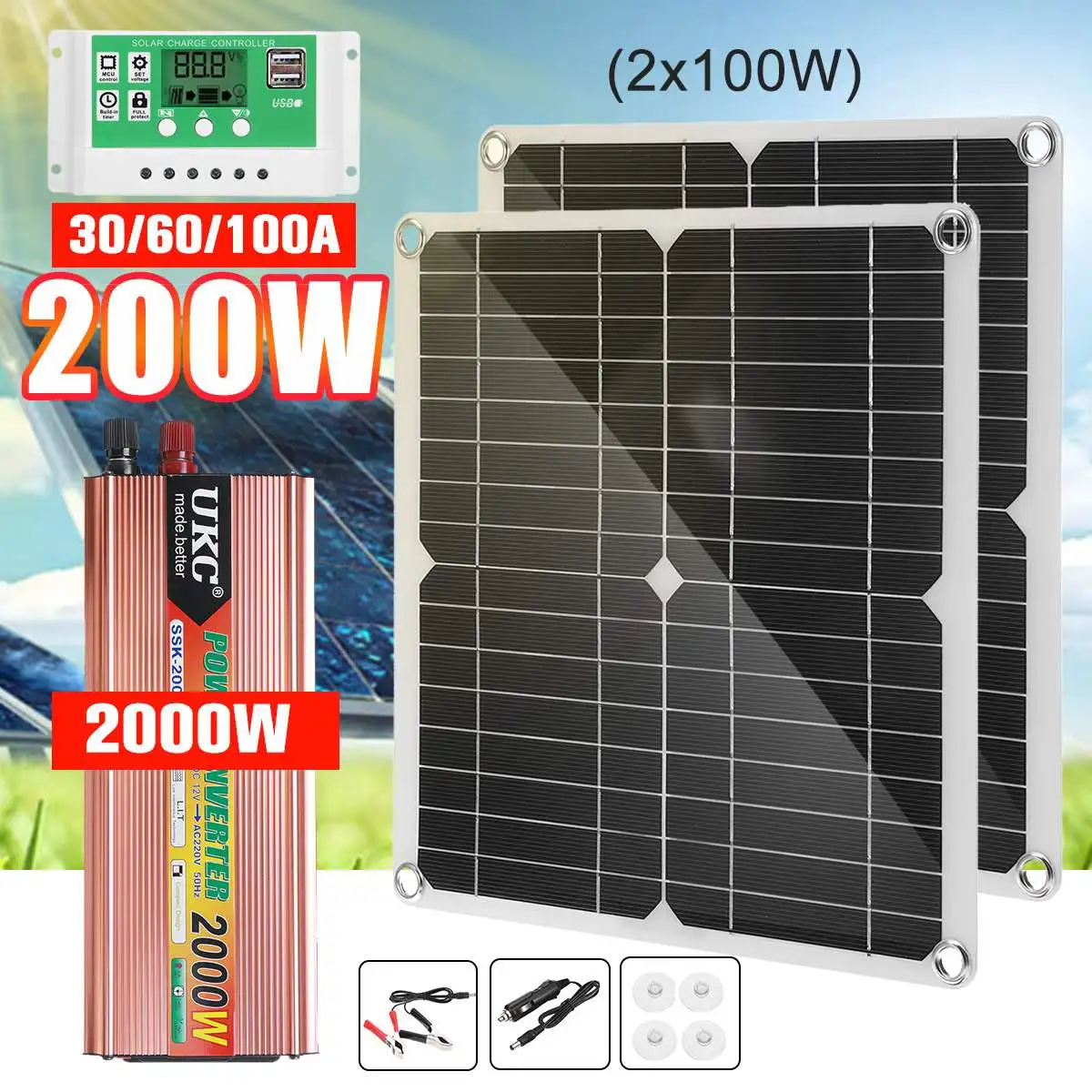 Особенности комплекта солнечной панели:-Используется для зарядки MP3 телефонов, планшетов и других контролируемых устройств.-Два женских USB-порта, вы можете легко заряжать устройство через USB-кабель для зарядки.-Вы можете поставить панель на солнце и использовать ее для прямой зарядки устройства.-Подходит для езды на велосипеде, альпинизма, пеших прогулок, кемпинга, путешествий и т. д.Особенности комплекта инвертора питания:-Преобразует питание аккумулятора постоянного тока 12 В в стандартный переменный ток 220 В.-Идеально подходит для питания, мобильных телефонов, ноутбуков, dvd-плееров, MP3-плееров и другой небольшой электроники.-Удобный дизайн с компактными размерами, легкий вес, высокая эффективность, удобство переноски.-Множественная надежная защита, универсальная розетка.Спецификация:Название продукта: комплект солнечных панелейРазмер: x мм/11x дюймаЦвет: многоцветныйМатериал: монокристаллический силиконКласс водонепроницаемости: IP65Конверсия: 23-24%Подходит для: велосипеда, альпинизма, пеших прогулок, кемпинга, путешествий и т. д.Комплектация:Комплект инвертора питания:1 х Инвертор1 х соединительная линия1 штекер прикуривателя1 х Руководство пользователяНабор 60A1 солнечная панель4 х Присоска1 зажим типа «крокодил»1 х Автомобильное зарядное устройство1 Солнечный контроллер 60 А1 х Инвертор1 х соединительная линия1 штекер прикуривателя1 х Руководство пользователя100A набор:1 солнечная панель4 х Присоска1 зажим типа «крокодил»1 х Автомобильное зарядное устройство1 Солнечный контроллер 100 А1 х Инвертор1 х соединительная линия1 штекер прикуривателя1 х Руководство пользователяДва комплекта солнечных панелей 60 А:2 солнечных панели8 X присоска2 зажима типа «крокодил»2 автомобильных зарядных устройства1 Солнечный контроллер 60 А1 х Инвертор1 х соединительная линия1 штекер прикуривателя1 х Руководство пользователяДва комплекта солнечных панелей 100 А:2 солнечных панели8 X присоска2 зажима типа «крокодил»2 автомобильных зарядных устройства1 Солнечный контроллер 60 А1 х Инвертор1 х соединительная линия1 штекер прикуривателя1 х Руководство пользователяПримечание:1. Возможны отклонения в 1-3 см (0,4-1,18 дюйма) из-за ручного измерения и небольшие различия в цвете из-за различных настроек дисплея.2. Из-за разницы светильник и экранах цвет изделия может немного отличаться от pi