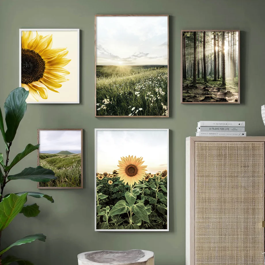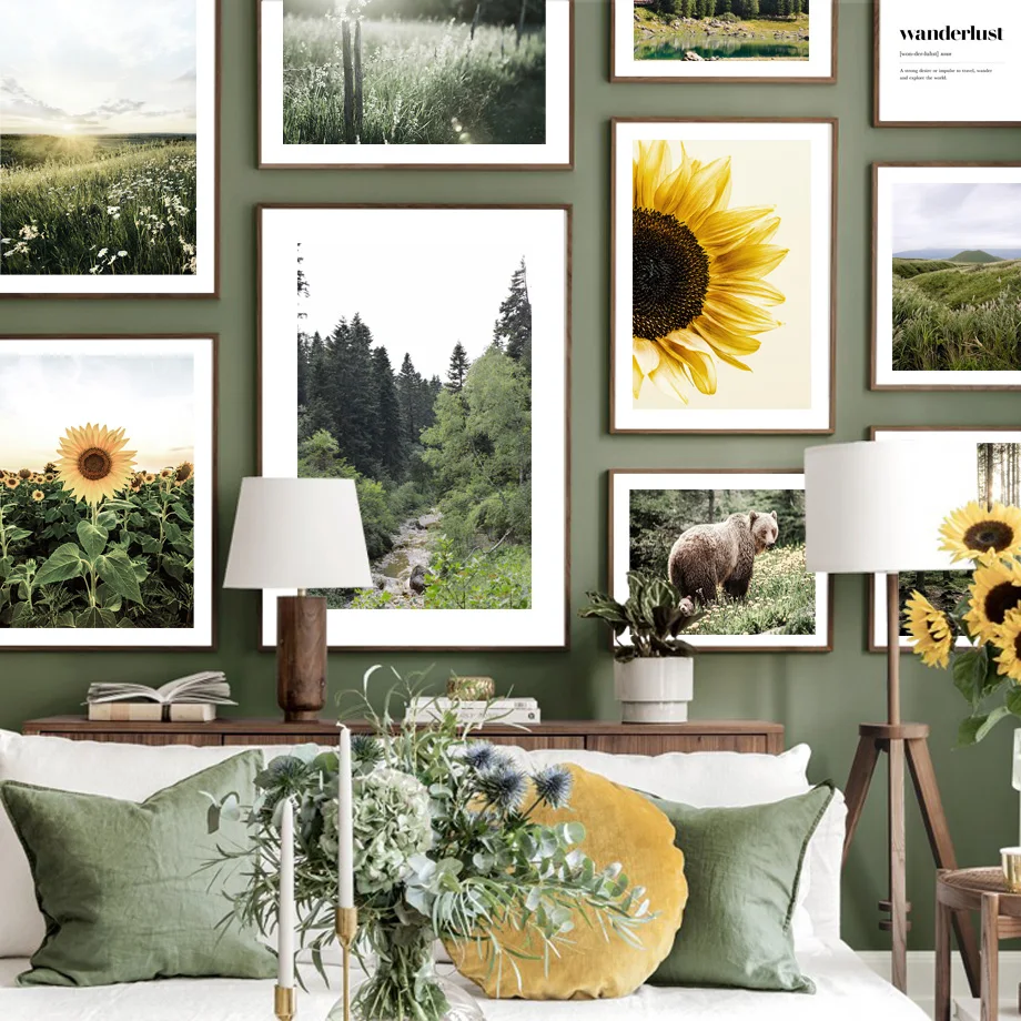 Картина на холсте, с подсолнухами, лугом, медведем, Восход Лес