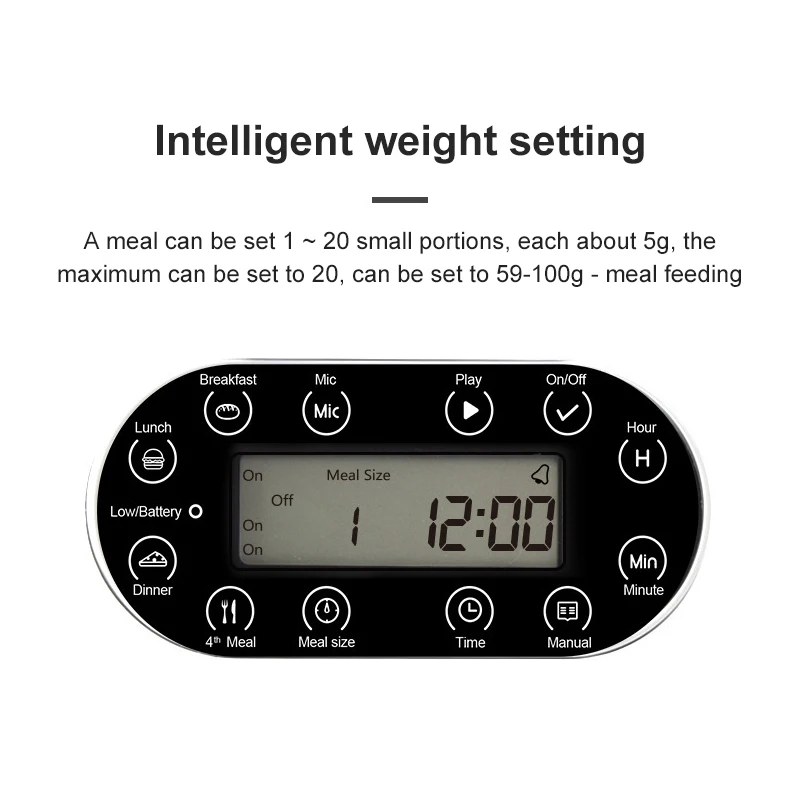 Размер еды составляет около 5g. Вы можете установить размер еды на 1-20 порций в соответствии с вашим питомцем. Этот питатель подходит для маленьких и средних домашних животных. Например, пудель, померань, пастух, биконс фризов, кошек и т. Д.