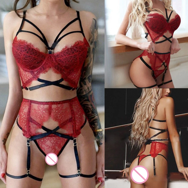 Пикантные Для женщин бондаж комплект нижнего белья размера плюс миниюбки экзотические сексуальное ночное кружево черный, Красный Лолита Нижнее белье Бюстгальтер Комплект бесшовных трусиков