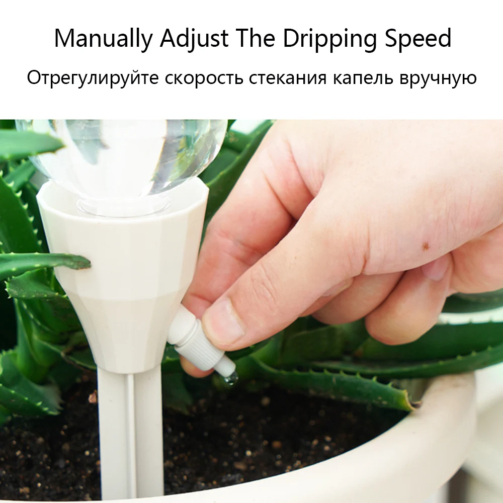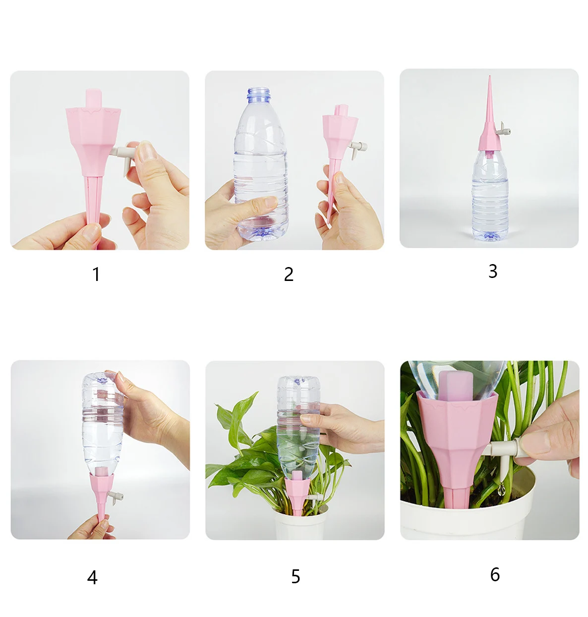 1. Установите регулирующий клапан2. Подключите бутылку воды к продукту3. Вставьте изделие в цветочный горшок4. Регулировка капельного клапана
