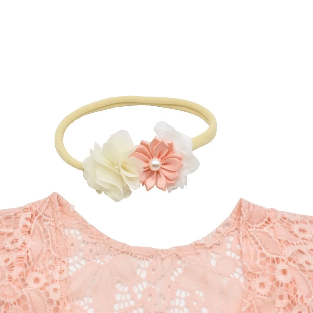 Летнее шифоновое цветочное украшение для новорожденных 0-1 месяц, кружевное платье, жемчужная повязка для волос, комплект из двух предметов, реквизит для фотографирования мальчиков и девочек