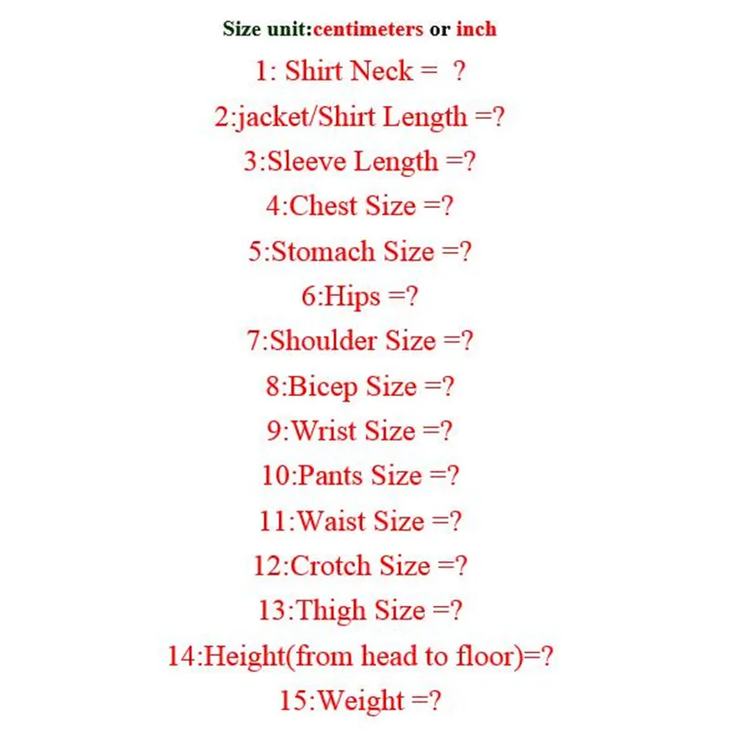 Мы можем изготовить костюмы стандартных размеров и костюмы пользовательских размеров. Если вы хотите костюмы стандартных размеров, вы можете выбрать стиль, который вы хотели, и сделать свой заказ. Если вы хотите выбрать размер на заказ. Нам нужны правильные измерения и цвет, вы можете измерить свое тело в соответствии со следующей картинкой. После этого вы можете написать их в примечании к заказу или нажать на сообщение продавец отправляет мне все измерения и цвет, когда вы делаете заказ.