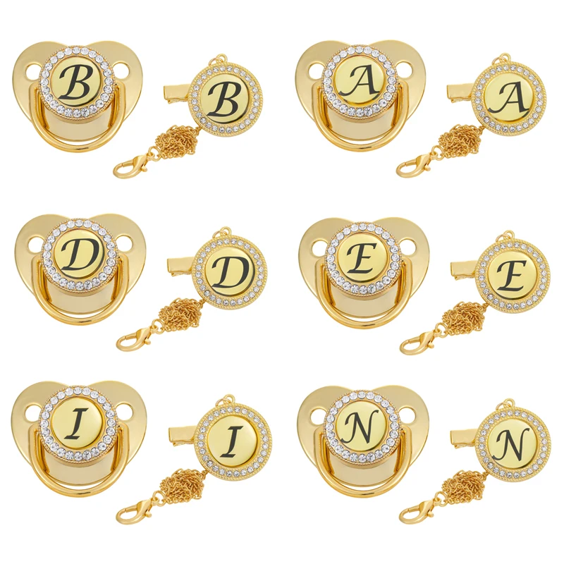 Детская пустышка на цепочке с прищепкой зажимы цепь 26 имя начальной буквы BPA бесплатные силиконовые детские соски на праздник в честь рождения ребенка; С золотыми блестящими новорожденных манекен