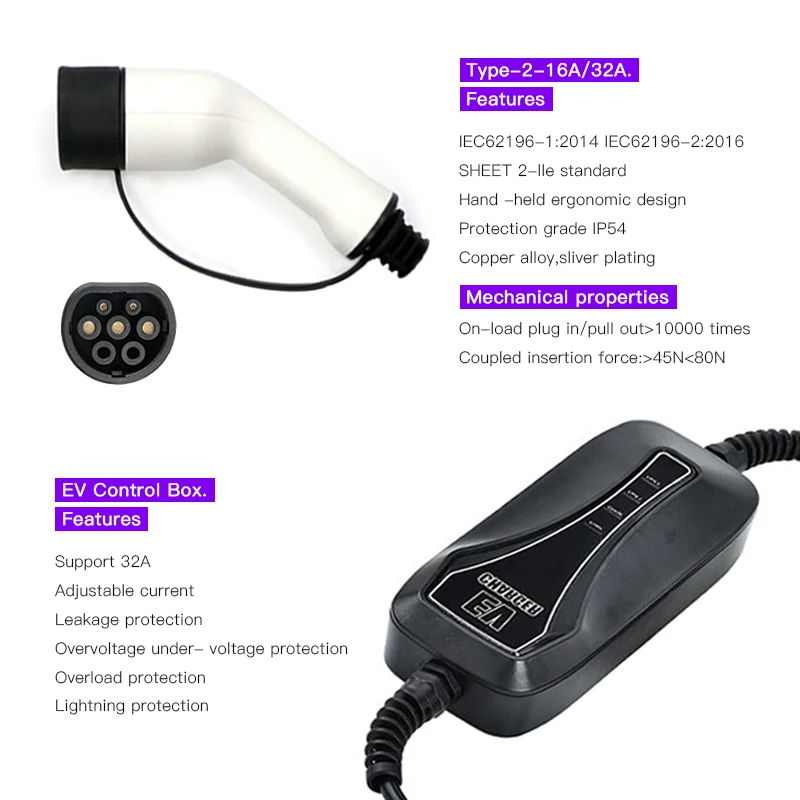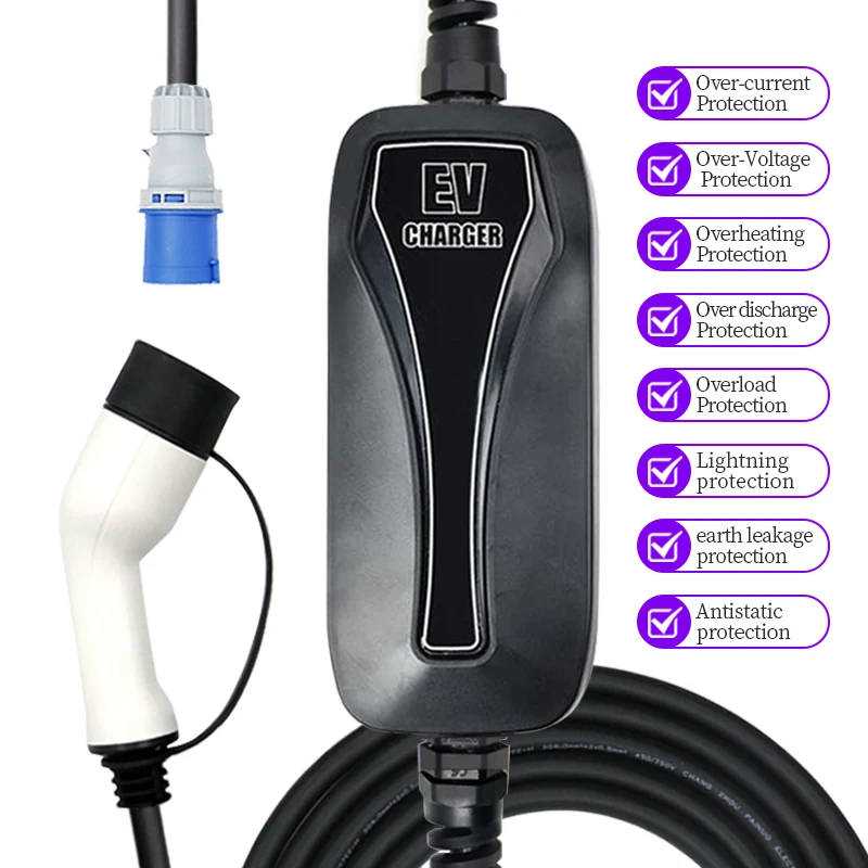 1. Разъем для зарядки: 7 контактов (соответствует стандарту IEC 62196-2)2. Разъем питания: синяя вилка CEE3. Длина шнура зарядного устройства: 5 м4. Номинальное Напряжение: 220/250V5. Номинальный ток: 32A6. Рабочая температура: -30 ℃ ~ + 55 ℃7. Рекомендуется использовать в помещении8. CE признанный компонент