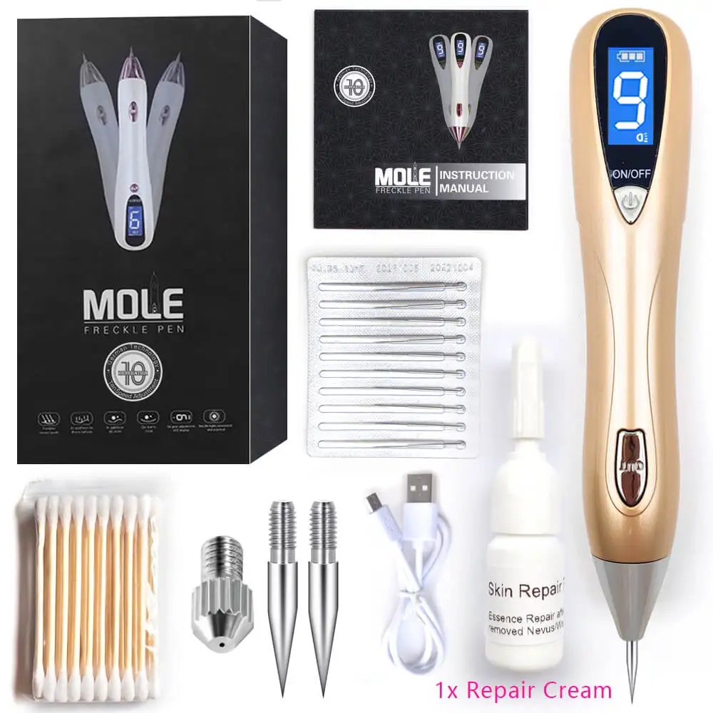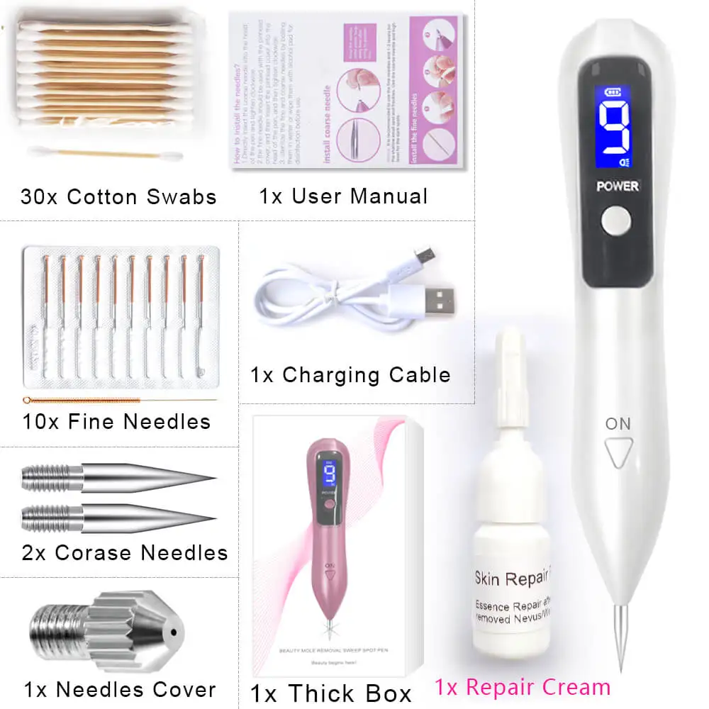 Посылка включает: 1 x крем для ремонта кожи 1 x прибор для удаления родинок Ручка 30 x ватные тампоны 5 x тонкие иглы 1 x грубые иглы 1 x крышка иглы 1 x usb-кабель для зарядки 1 x Руководство пользователя 1 x упаковочная коробка> 3 регулируемые уровни> без ЖК-дисплея