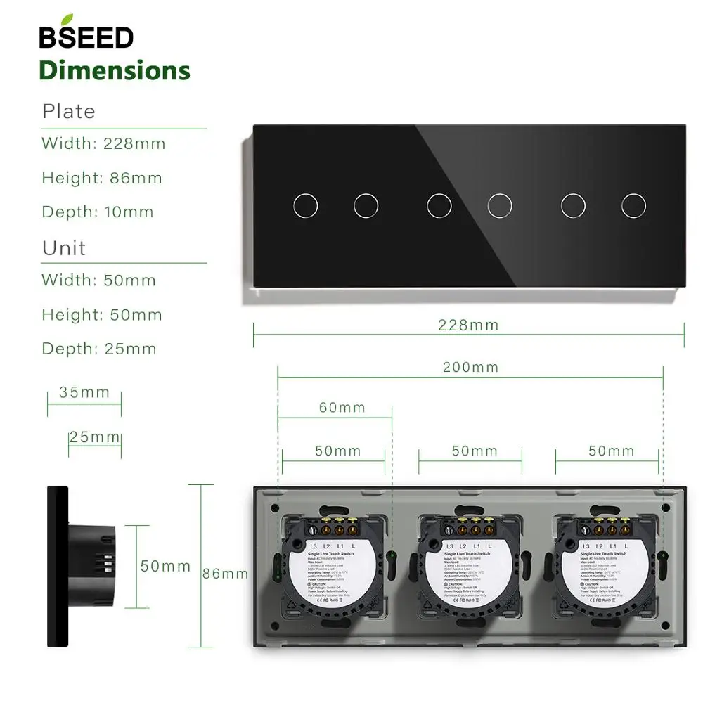 Сенсорный настенный выключатель BSEED, настенный выключатель с датчиком, 6 каналов, 300 Вт/Gang Crystal Galss, водонепроницаемый светодиодный выключатель со стандартом ЕС
