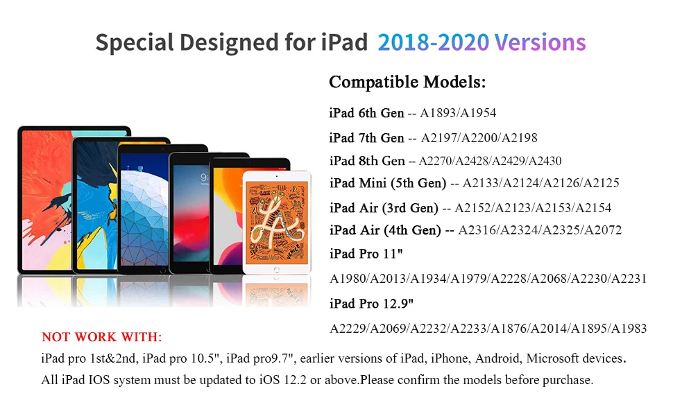 Стилус не поддерживает iPad pro 1st и 2nd, iPad pro 10,5 ", iPad pro 9,7", iPad 1-5 Gen, iPad mini 1-4 Gen, iPad Air 1st/2nd Gen версии iPad. Не совместим с устройствами iPhone, Android, Microsoft.