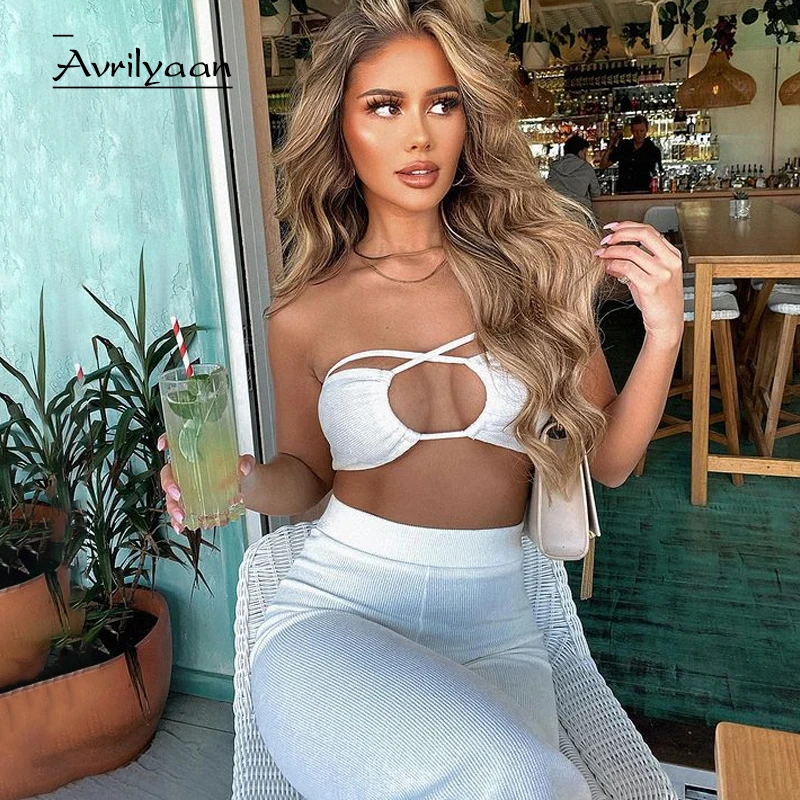 Avrilyaan летние белые Вязание полосатый Двойка комплект сексуальный топ c бретелькой через шею длинные брюки Для женщин Набор Элегантный женский комплект 2 шт. Для женщин набор