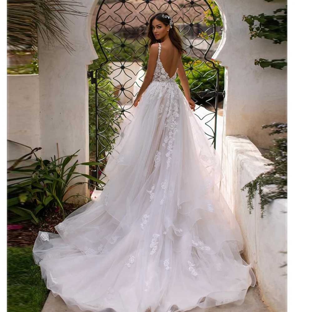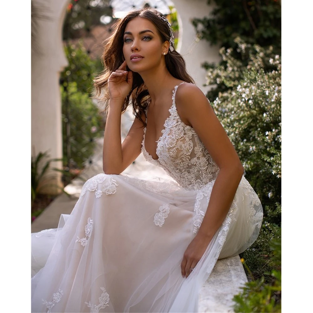 Простые Свадебные платья 2021 Кружевная аппликация Глубокий вырез б...