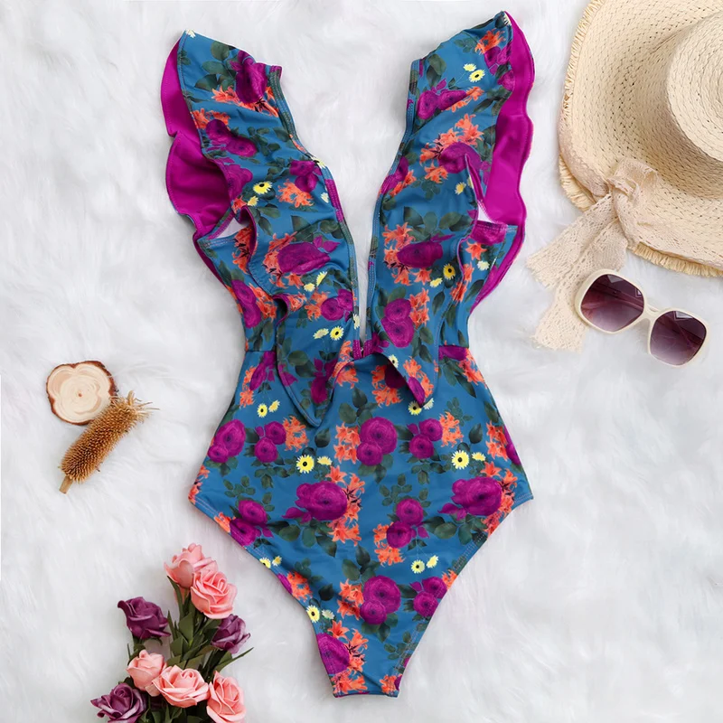 Слитный женский купальник с оборками, 2021 сексуальный глубокий V-о...