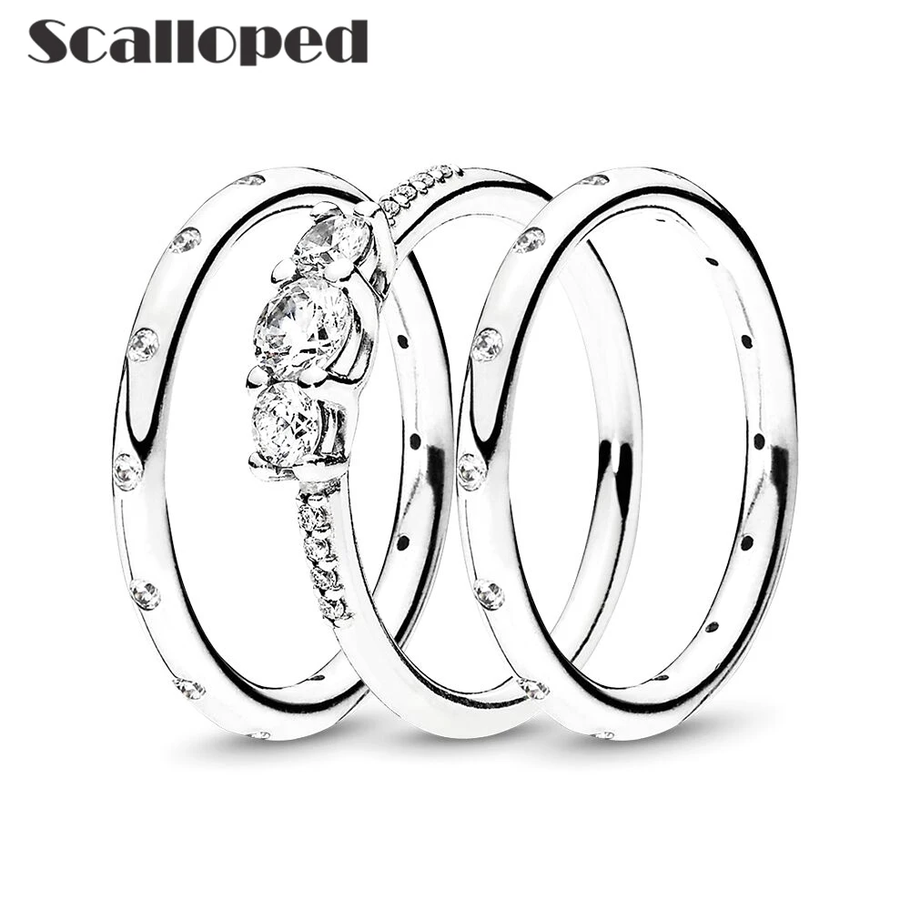 Модные зубчатые обручальные кольца из прозрачного циркона с тремя камнями, Женские Простые сверкающие циркониевые штабелируемые кольца, ювелирные изделия для помолвки пары