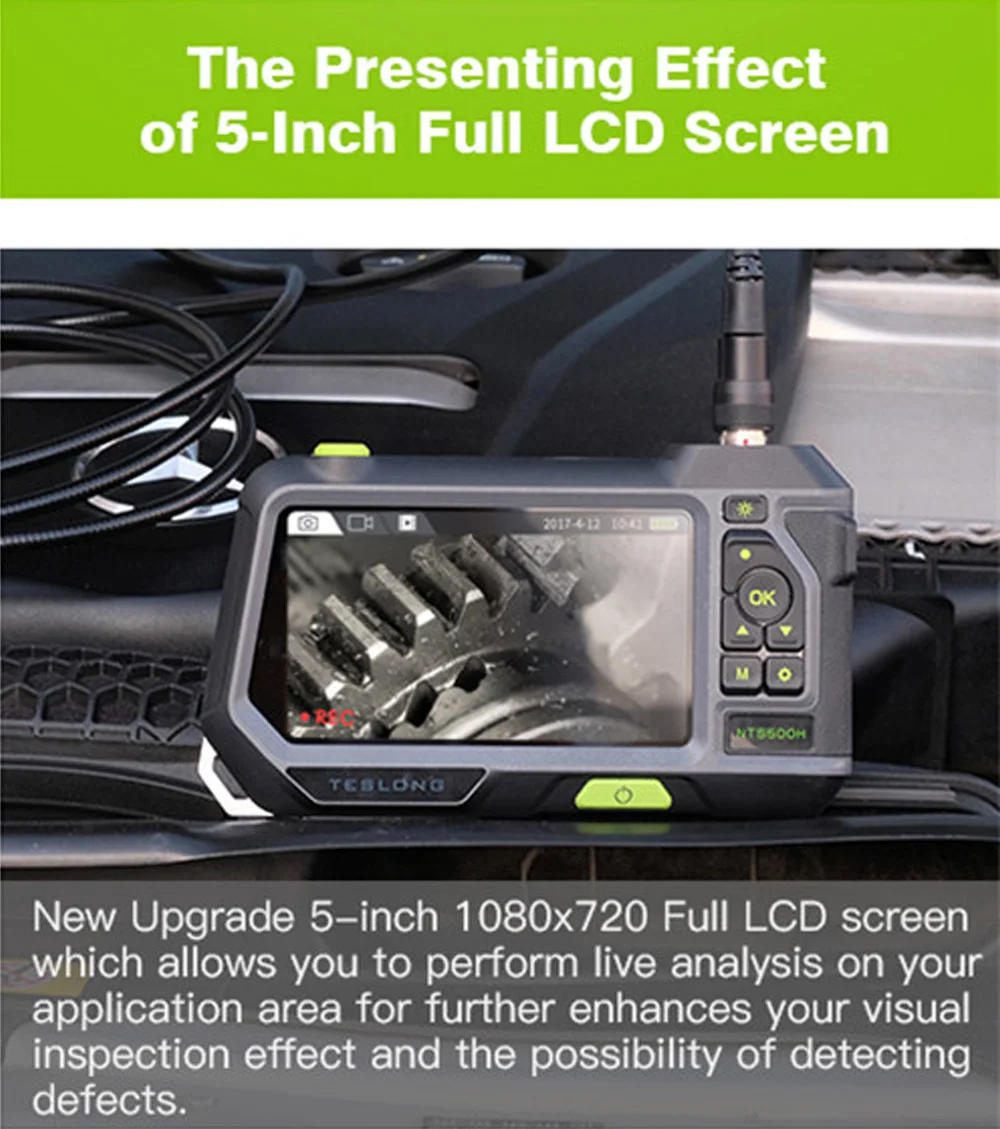 1. 5 дюймов Супер Big1280P HD Экран эндоскоп-крупнейший в Рынок: просмотр 1280*720P изображение с 5 дюймов Цветная hd-камера заднего вида c ЖК-дисплей монитор, наслаждайтесь и записывайте четкое hd-видео с близкого расстояния и фото с помощью этого бороскопа. Возьмите его домой и наслаждайтесь потрясающим визуальным наслаждением.2. Когда вы хотите увидеть различные углы с трубами, двигателями, машинами, но чувствуете себя трудно с вашей инспекционной камерой? Просто посмотрите! Бороскоп имеет фронтальную камеру и боковую камеру в зонде камеры, что позволяет просматривать четкое изображение с разных углов.3. Супер классные HD 1280*720P Бороскоп-по-настоящему 1280*720P камера наблюдения с 6 регулируемый светодиодный Светодиодный светильник и металлические «гусиная шея», таким образом, вы можете просмотреть более четкое изображение в самых плотных пространствах и темных условиях. Корпуса Принимает прочный induatrial класс материала; 5-на экране не будет легко ломаются и царапин с защитой закаленное стекло (входит в комплект).4. Подходит для детей с артистическим Ёмкость Батарея и IP67 Водонепроницаемый: Этот цифровой эндоскоп улучшили Батарея, основанных на li-ion 3,7 в/3500 мА/ч, литий-ионный, который может поддерживать эту бороскоп работать непрерывно в течение 4 часов. Водонепроницаемый кабель для камеры IP67 со змеиным узором позволяет вам исследовать Сабо под водой, не беспокоясь о том, что ваш эндоскоп укоротится.5. Мы стремимся к 100% удовлетворенности клиентов: 30 дней возврата денег и 12 месяцев поддержки. Если у вас есть какие-либо вопросы, просто напишите нам для бесплатного обслуживания клиентов. Посылка: NTS500 промышленный эндоскоп с двумя объективами, Кабель Micro-USB, карта TF 32G, руководство пользователя, жесткий пластиковый чехол.