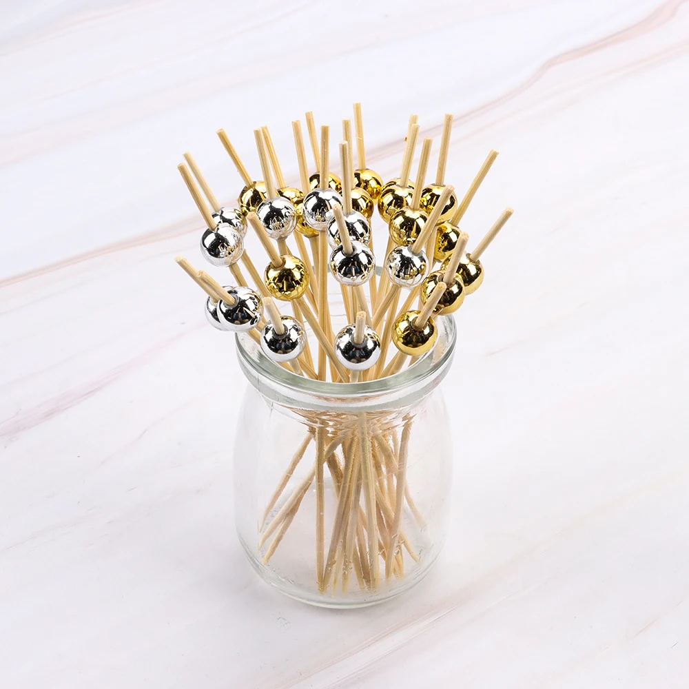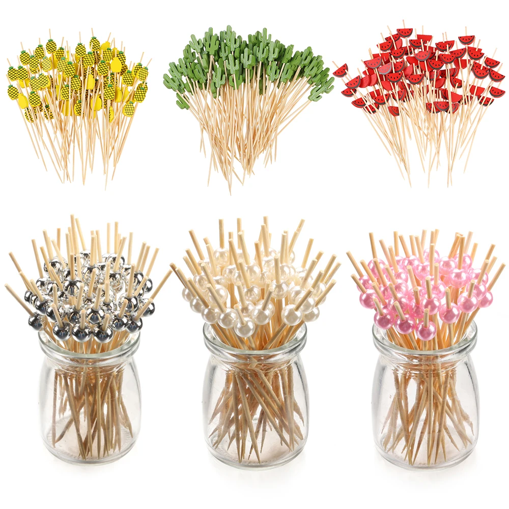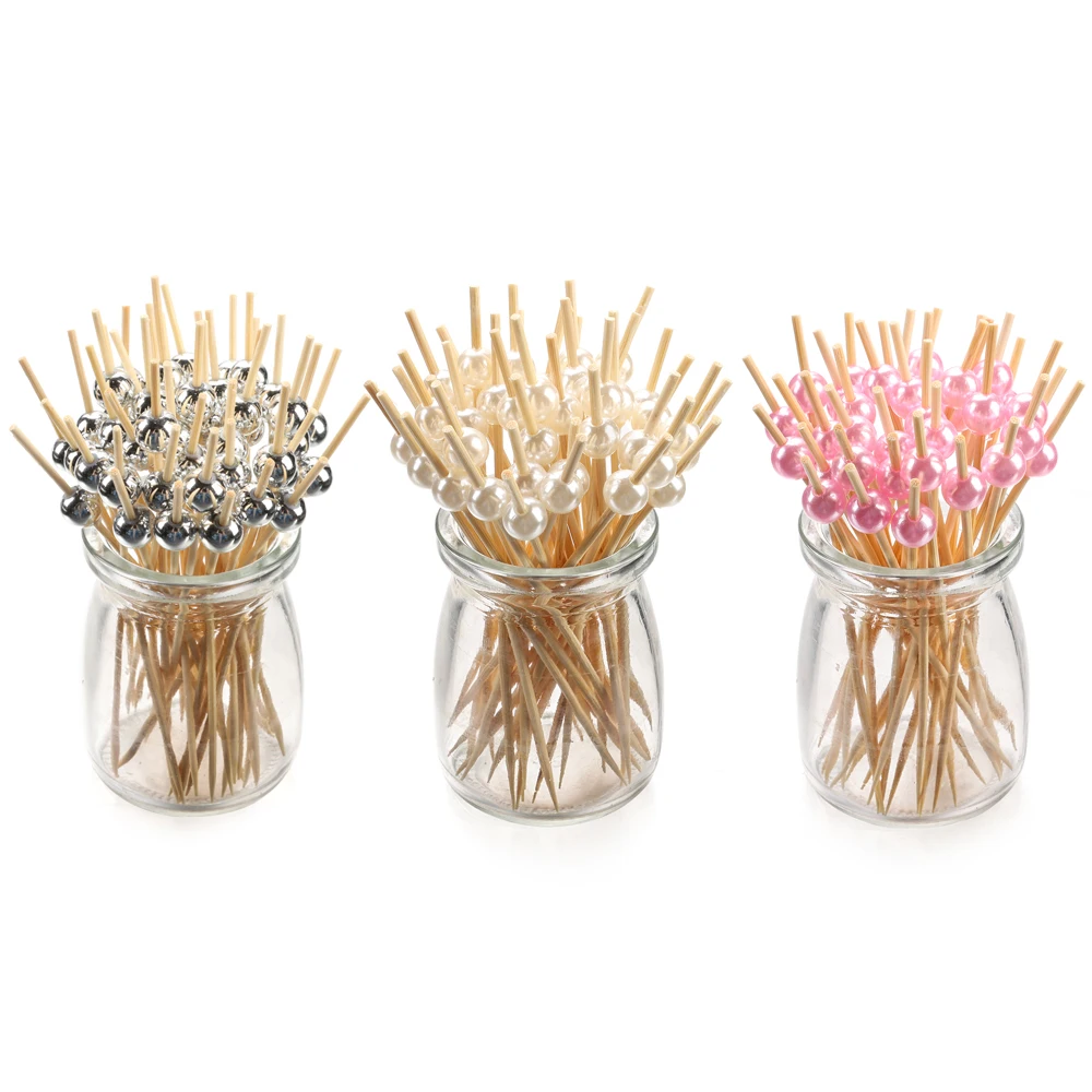 Головка бамбуковой палочки разработана в яркой жемчужной форме, которая, очевидно, более элегантна, красочна и привлекательна, чем обычные бамбуковые палочки, чтобы украсить еду, напитки или столешницы.