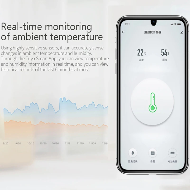 2. Восприятие температуры и влажности в реальном времени и отчет в реальном времени для ваших смартфонов с поддержкой приложения smart Life Tuya. Просмотр истории записи в приложении для интеллектуального контроля температуры и влажности вашего дома. Контролируйте температуру и влажность вашего дома независимо от того, где вы находитесь.