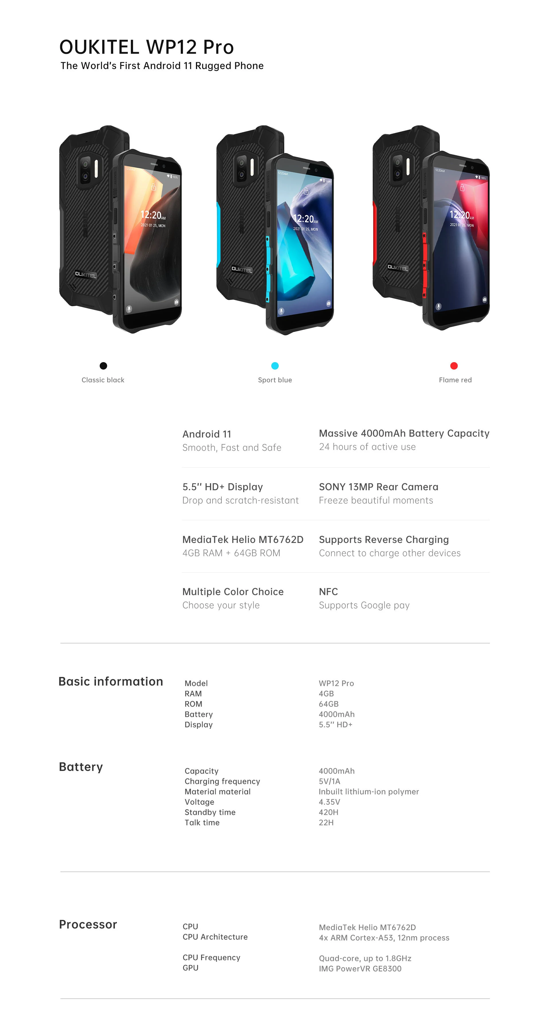 Смартфон OUKITEL WP12 Pro защищенный, 4 Гб + 64 ГБ, IP68, Восьмиядерный процессор MT6762D, Android 11, экран 5,5 дюйма HD +, 4000 мА ч, мобильный телефон дюйма, NFC