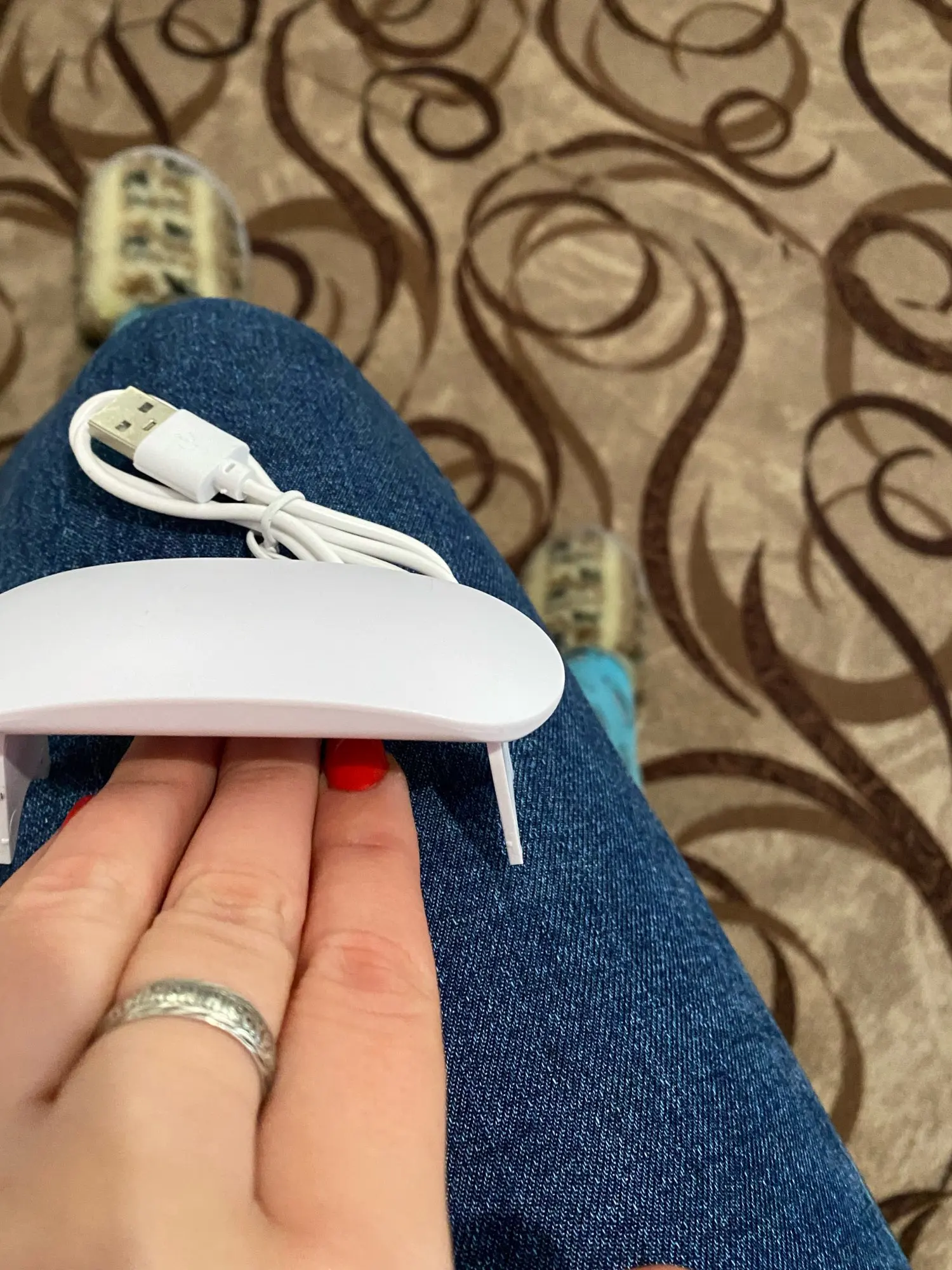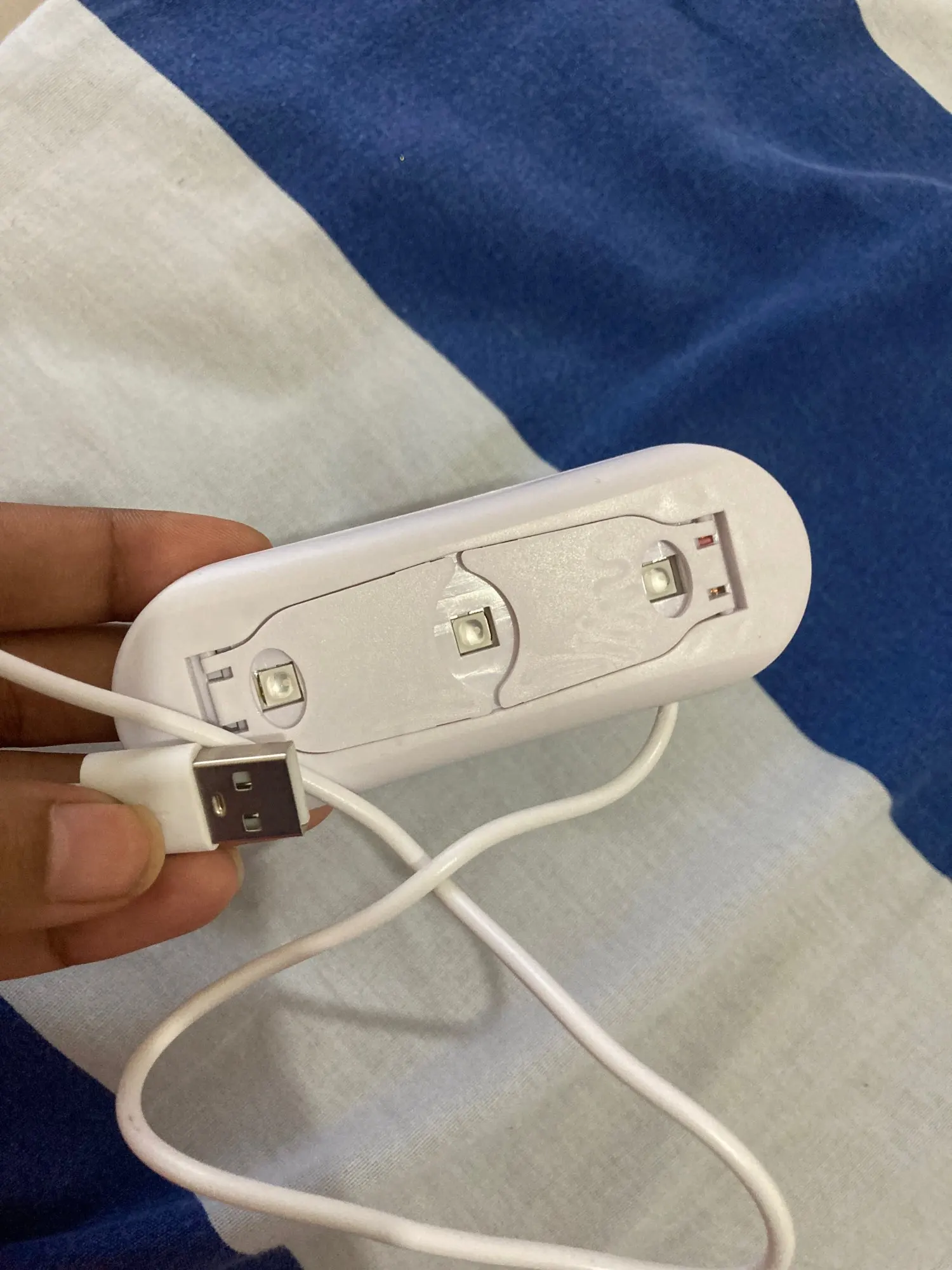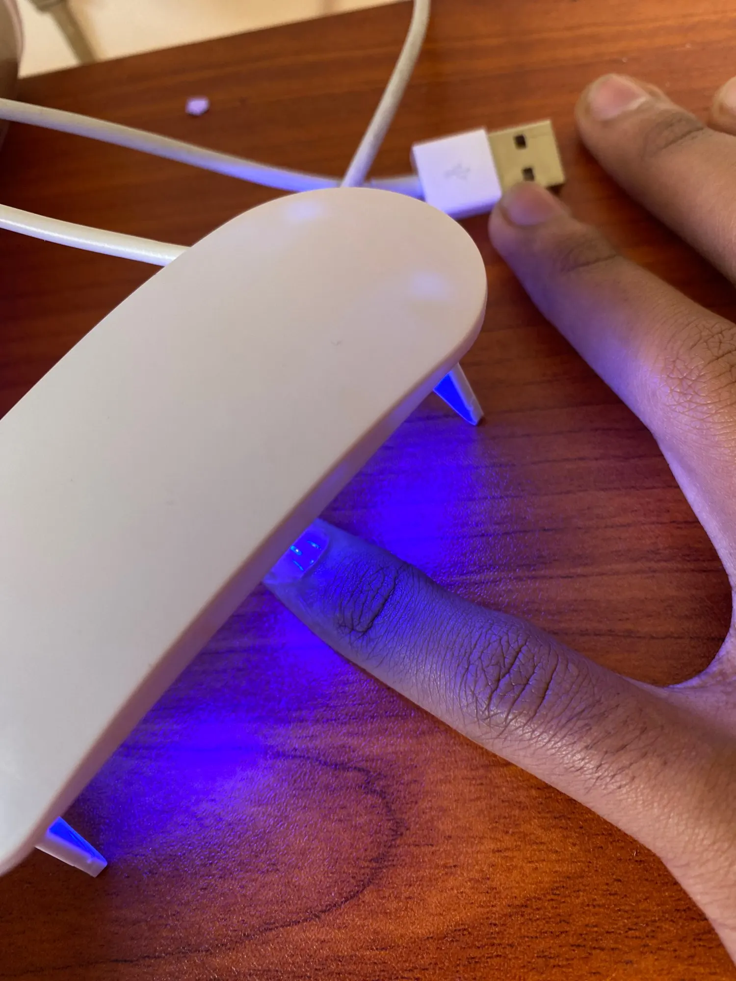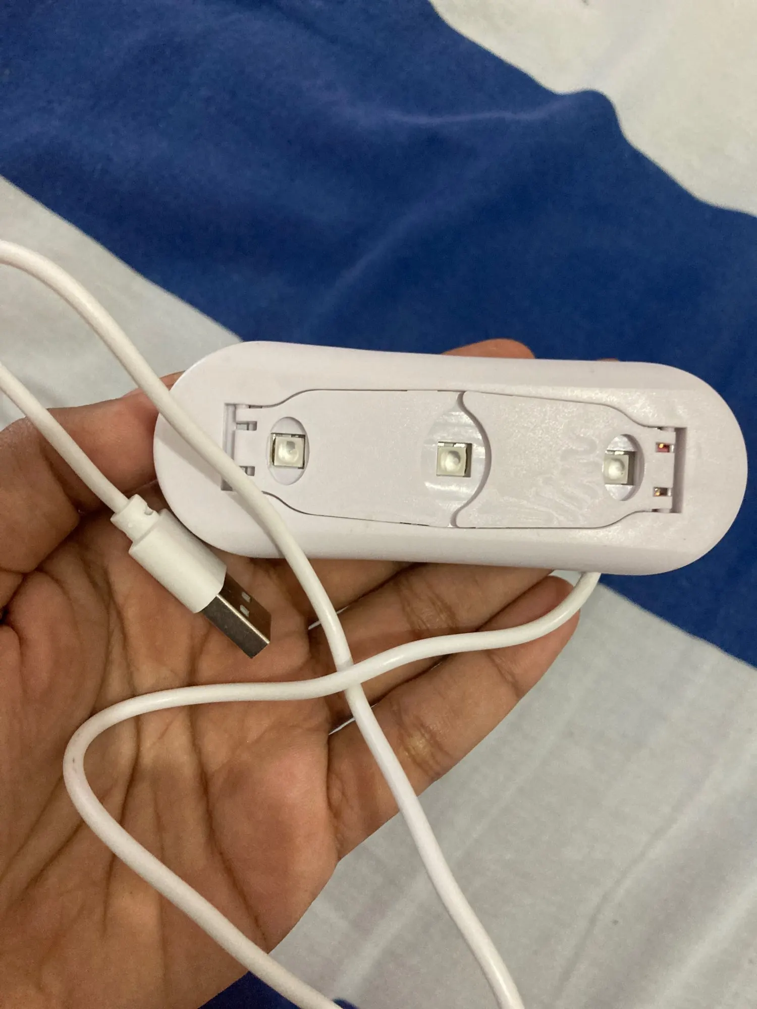 лампа пришла меньше, чем за месяц. крошечная, но лак сушит неплохо. в комплекте USB шнур, для работы пришлось использовать блок питания от телефона