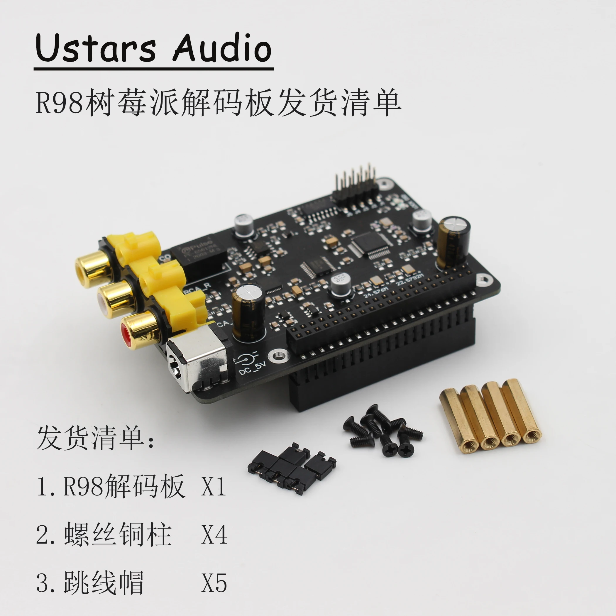 Введение R98 Raspberry Pi цифровой аудио декодер платы1. Профессиональное решение для цифровой обработки SPDIF, коаксиальный выход поддержки 384K/DOP128, seckill частоСм. План AK4118, 1M88042. Синхронизация локальных звуковые часы, Избегайте использования PLL для генерации часов и вызвать холодный звук3. Raspberry Pi использует IIS для ввода и воспроизведения музыки, прослушивание музыки плавное, реальное и естественное, и никогда не используетсяОщущение паузы, которое трудно обнаружить при воспроизведении В режиме USB4. Используйте общую версию VOLUMIO, MoodeAudioVOLUMI0 официальная версия может поддерживать 44,1-192 кГц DSD64 исходный код выводаОфициальная версия MoodeAudio может поддерживать 44,1-384 кГц DSD64-DSD128 исходный код5. Нет необходимости устанавливать выходное повторное воспроизведение, просто выключите его по умолчанию, действительно оригинальный код без потерь6. Принимает DS8921, специальный чип драйвера для коаксиального, который признан хорошим звуком7. Декодирование аудио принимает текущее хорошее звучание CS43198, и звук прочный и деликатный.R98 Raspberry Pi цифровой аудио декодер параметры платы:Цифровой выход:Коаксиальный: PCM 44,1 кГц-384 кГц/24 битDSD DSD64/ 128 (DOP)Аналоговый выход:Чип декодера DAC: CS43198PCM 44,1 кГц-384 кГц/32 битDSD DSD64/ 128/256 (твердое решение)DSD64/128 (жесткий решение, прямой режим DSD)Двухканальный выход RCA: 2,0 Vrms/-0 дБ THD + N: 0. 0005% @ 1 кГц1. 73Vrms/-0 дБ (прямой режим DSD)Прямой режим DSD: сигнал DSD проходит без цифрового фильтра DSD, который является режимом NOS.Этот режим воспроизводит только музыкальные файлы DSD, и он действителен при подключении jumper J5.Описание тестового параметра:Raspberry Pi 4B (версия 1,2) Установите оптимизированную версию MoodeAudio640,Выходные настройки: Audiophonics. ES9028/9038 DAC, измеряется воспроизведением музыкальных файлов на u-диске,Будут различия при других условиях, например: MoodeAudio7 01 может поддерживать PCM384KHz/DSD1280: подключение, X: отключение0: подключение, X: отключениеПитание:Питание:Блок питания 5 в платы напрямую подключен к интерфейсу 40P Raspberry Pi. Существует два способа питания:Блок питания 5 в платы напрямую подключен к интерфейсу 40P Raspberry Pi. Существует два способа питания:А. Непосредственно Используйте micro_usb для питания Raspberry Pi, а Интерфейс Raspberry Pi 40P обеспечивает питание платыОдин. Непосредственно Используйте micro-USB для питания Raspberry Pi, а Интерфейс Raspberry Pi 40p обеспечивает питание платыB. Питание поставляется от входного интерфейса разъема постоянного тока платы, а питание поставляется к дереву с помощью интерфейса 40P с платыB. Питание поставляется от входного интерфейса разъема постоянного тока платы, а плата обеспечивает питание к дереву с помощью интерфейса 40p** Только один из двух способов питания может использоваться одновременно, и два не могут быть использованы одновременно** Только один из двух способов питания может использоваться одновременно, и два не могут быть использованы одновременноИспользование, в противном случае это может привести к повреждению платы, дерева или источника питания.Использование, в противном случае это может привести к повреждению платы, дерева или источника питания.Характеристики входного интерфейса платы:Характеристики входного интерфейса платы:Напряжение источника питания: стабилизированное напряжение постоянного тока + 5 В, диапазон напряжения: ± 5%Напряжение источника питания: стабилизированное напряжение постоянного тока + 5 В, диапазон напряжения: ± 