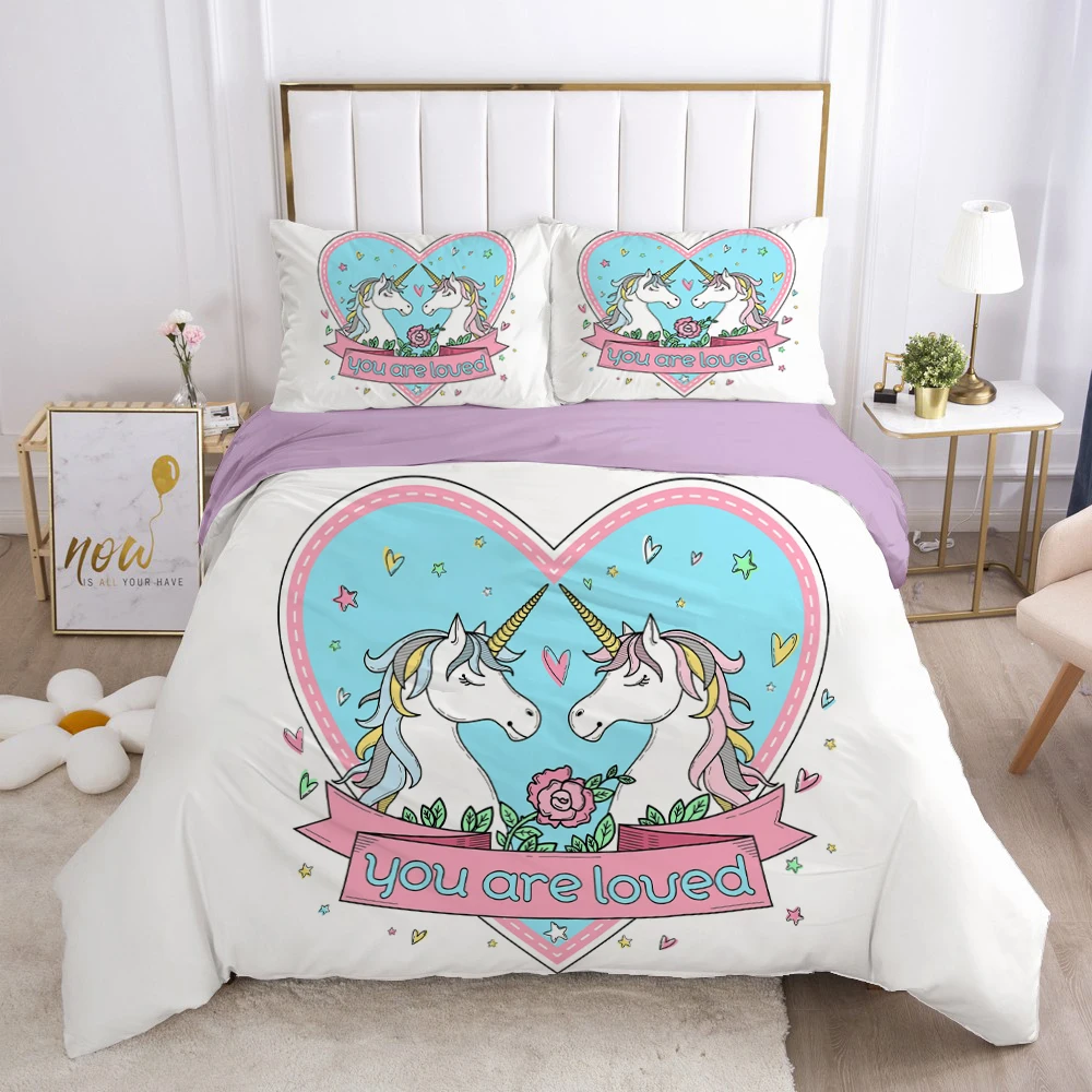 Сказка Единорог розового и фиолетового цветов постельного белья двухместные Queen King Размеры Комплект постельного белья с изображением героев из мультфильмов, с лошадкой одеяла Пододеяльники Крышка для маленьких девочек